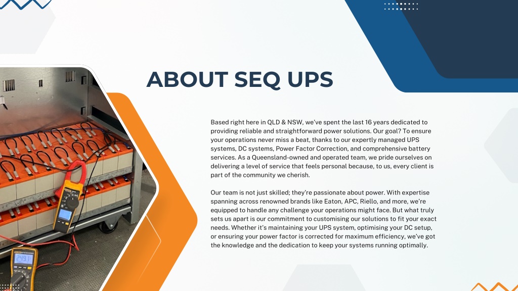 2. ABOUT SEQ UPS Based right here in QLD & NSW, we’ve spent the last 16 years dedicated to providing reliable and straightforward power solutions. Our goal? To ensure your operations never miss a beat, thanks to our expertly managed UPS systems, DC systems, Power Factor Correction, and comprehensive battery services. As a Queensland-owned and operated team, we pride ourselves on delivering a level of service that feels personal because, to us, every client is part of the community we cherish. Our team is not just skilled; they’re passionate about power. With expertise spanning across renowned brands like Eaton, APC, Riello, and more, we’re equipped to handle any challenge your operations might face. But what truly sets us apart is our commitment to customising our solutions to fit your exact needs. Whether it’s maintaining your UPS system, optimising your DC setup, or ensuring your power factor is corrected for maximum efficiency, we’ve got the knowledge and the dedication to keep your systems running optimally.