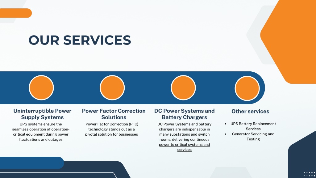 3. OUR SERVICES Uninterruptible Power Supply Systems Power Factor Correction Solutions DC Power Systems and Battery Chargers Other services UPS Battery Replacement Services Generator Servicing and Testing UPS systems ensure the seamless operation of operation- critical equipment during power fluctuations and outages Power Factor Correction (PFC) technology stands out as a pivotal solution for businesses DC Power Systems and battery chargers are indispensable in many substations and switch rooms, delivering continuous power to critical systems and services