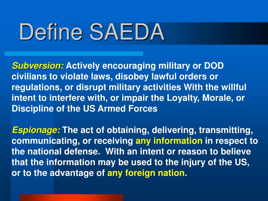 Define SAEDA Subversion: Actively encouraging military or DOD civilians to violate laws, disobey lawful orders or regulations, or disrupt military activities With the willful intent to interfere with, or impair the Loyalty, Morale, or Discipline of the US Armed Forces Espionage: The act of obtaining, delivering, transmitting, communicating, or receiving anyinformation in respect to the national defense.With an intent or reason to believe that the information may be used to the injury of the US, or to the advantage of anyforeign nation.