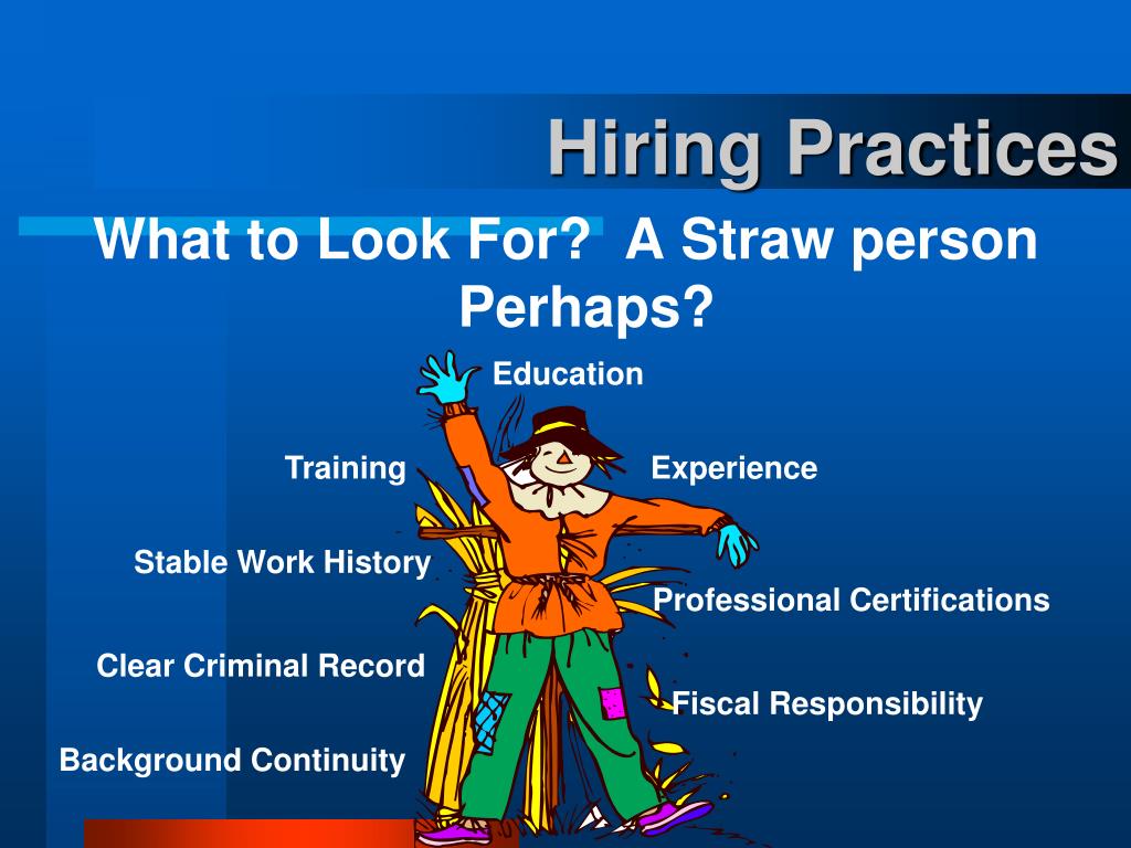 Hiring Practices What to Look For? A Straw person Perhaps? Education Training Experience Stable Work History Professional Certifications Clear Criminal Record Fiscal Responsibility Background Continuity