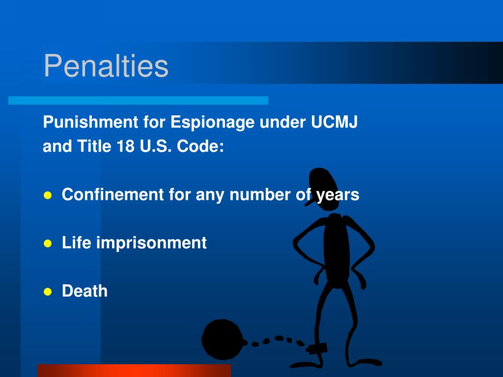 Penalties Punishment for Espionage under UCMJ and Title 18 U.S. Code: • Confinement for any number of years • Life imprisonment • Death