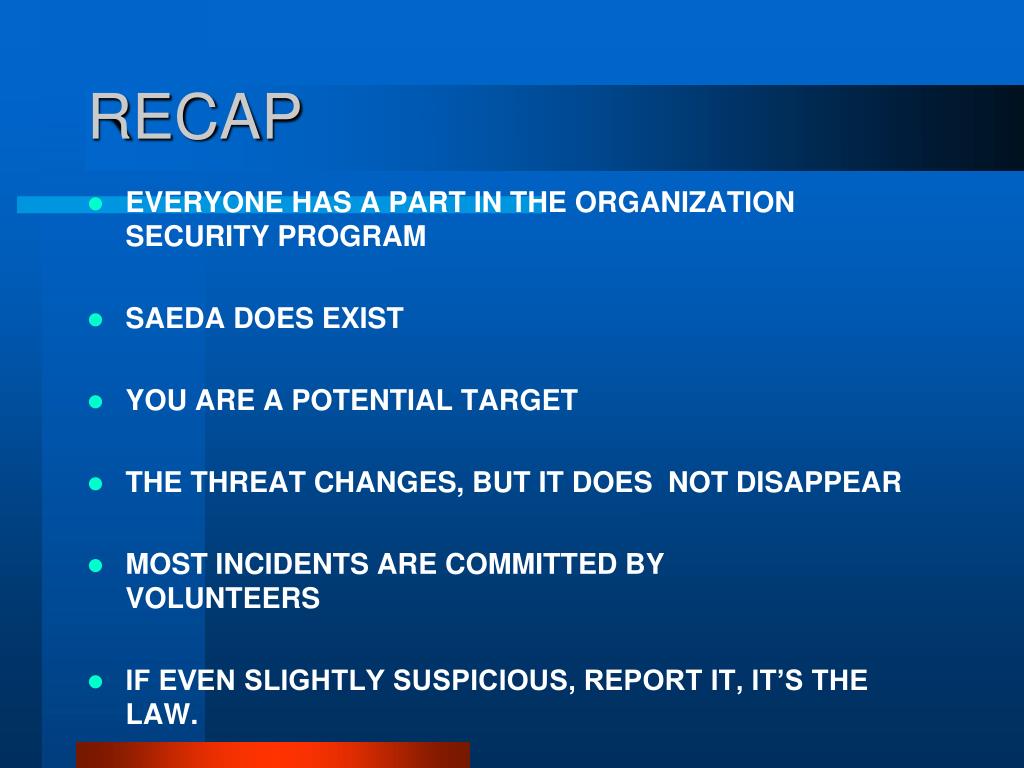 RECAP • EVERYONE HAS A PART IN THE ORGANIZATION SECURITY PROGRAM • SAEDA DOES EXIST • YOU ARE A POTENTIAL TARGET • THE THREAT CHANGES, BUT IT DOES NOT DISAPPEAR • MOST INCIDENTS ARE COMMITTED BYVOLUNTEERS • IF EVEN SLIGHTLY SUSPICIOUS, REPORT IT, IT’S THE LAW.