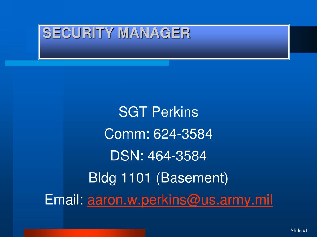 SECURITY MANAGER SGT Perkins Comm: 624-3584 DSN: 464-3584 Bldg 1101 (Basement) Email: aaron.w.perkins@us.army.mil Slide #1