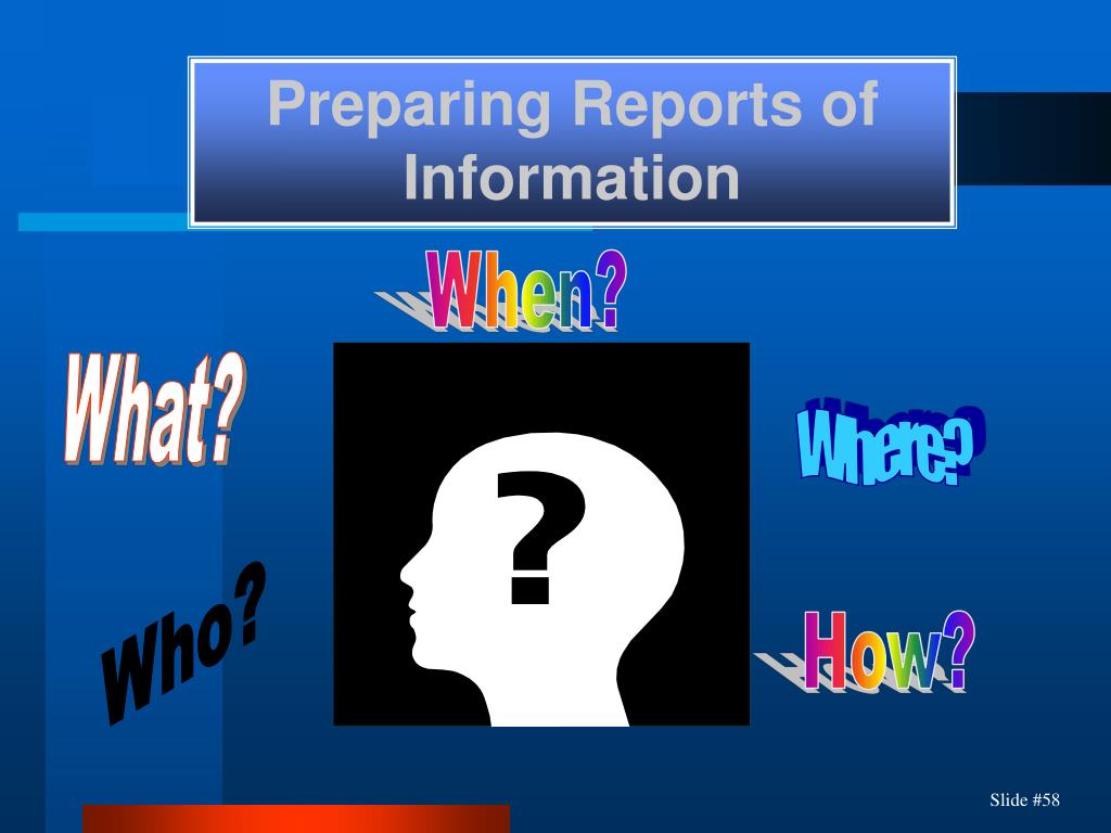 Preparing Reports ofInformation When? What? Where? Who? How? Slide #58