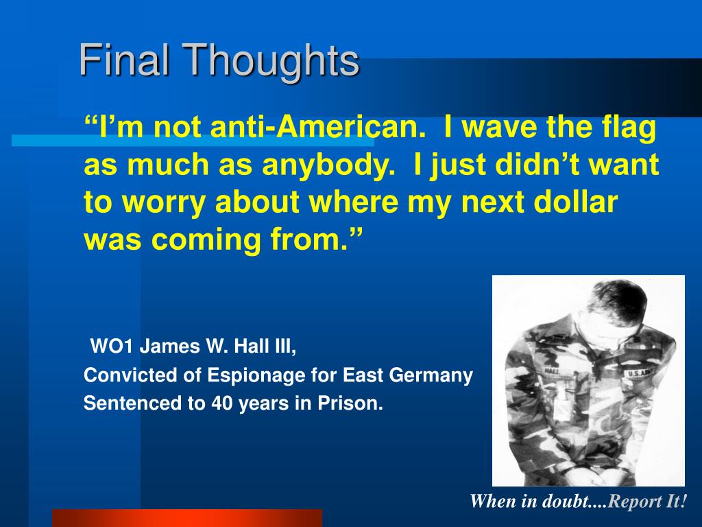 Final Thoughts “I’m not anti-American. I wave the flag as much as anybody. I just didn’t want to worry about where my next dollar was coming from.” WO1 James W. Hall III, Convicted of Espionage for East Germany Sentenced to 40 years in Prison. When in doubt....Report It!
