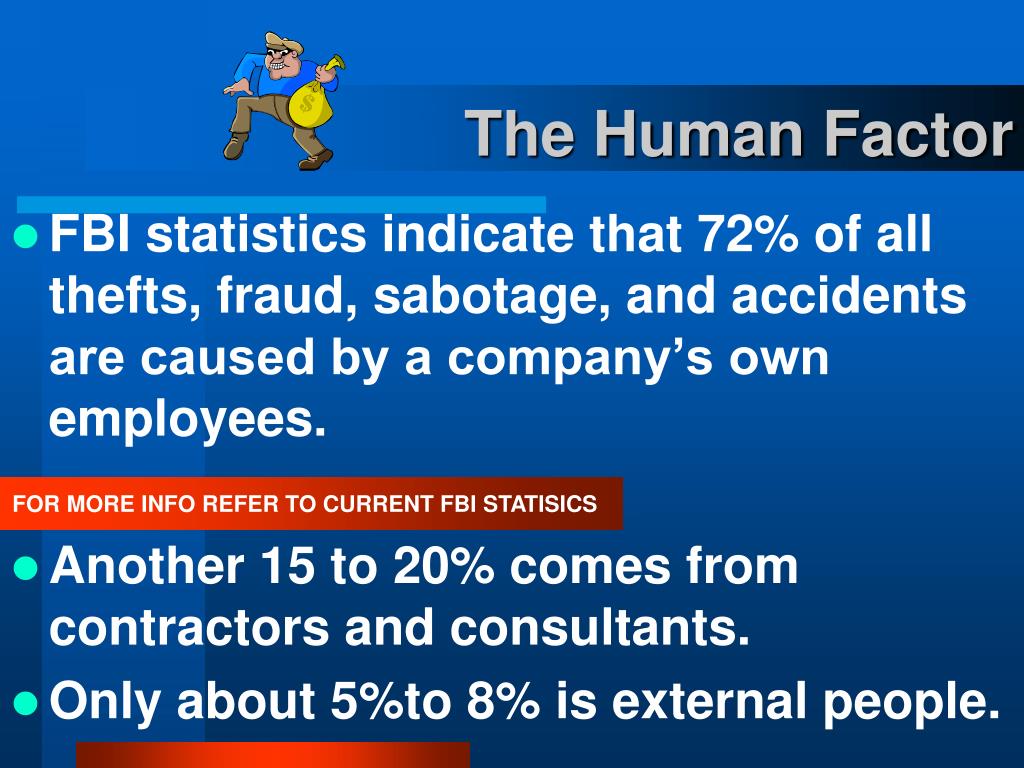 The Human Factor • FBI statistics indicate that 72% of all thefts, fraud, sabotage, and accidents are caused by a company’s own employees. • Another 15 to 20% comes from contractors and consultants. • Only about 5%to 8% is external people. FOR MORE INFO REFER TO CURRENT FBI STATISICS