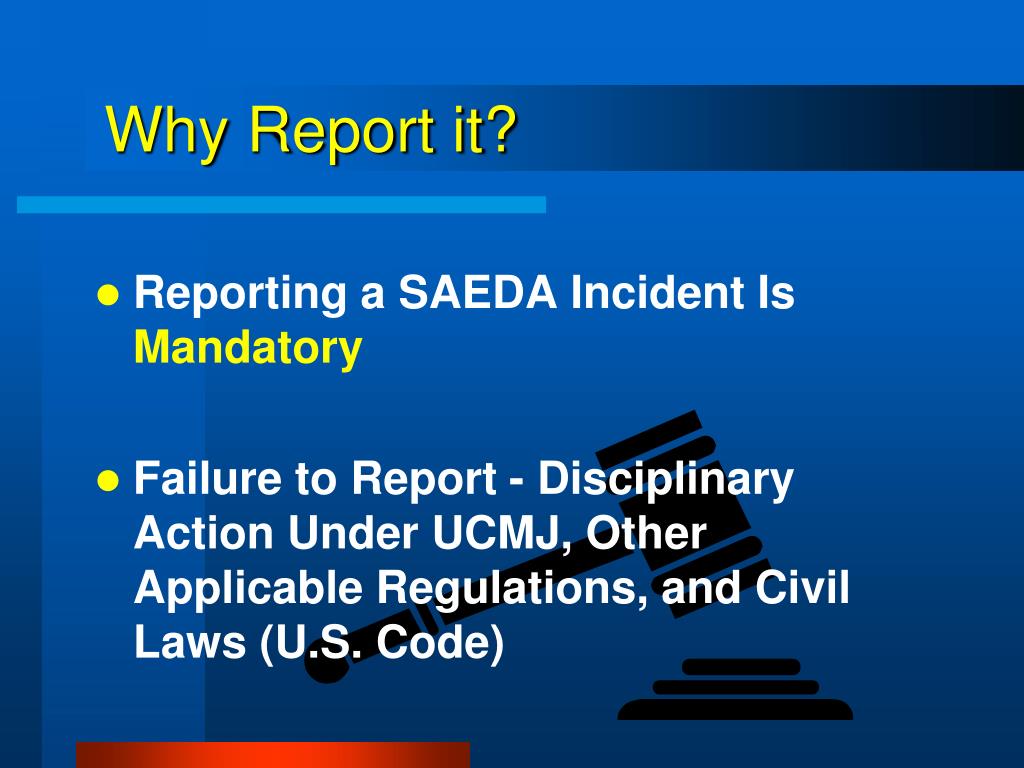 Why Report it? • Reporting a SAEDA Incident Is Mandatory • Failure to Report - Disciplinary Action Under UCMJ, Other Applicable Regulations, and Civil Laws (U.S. Code)