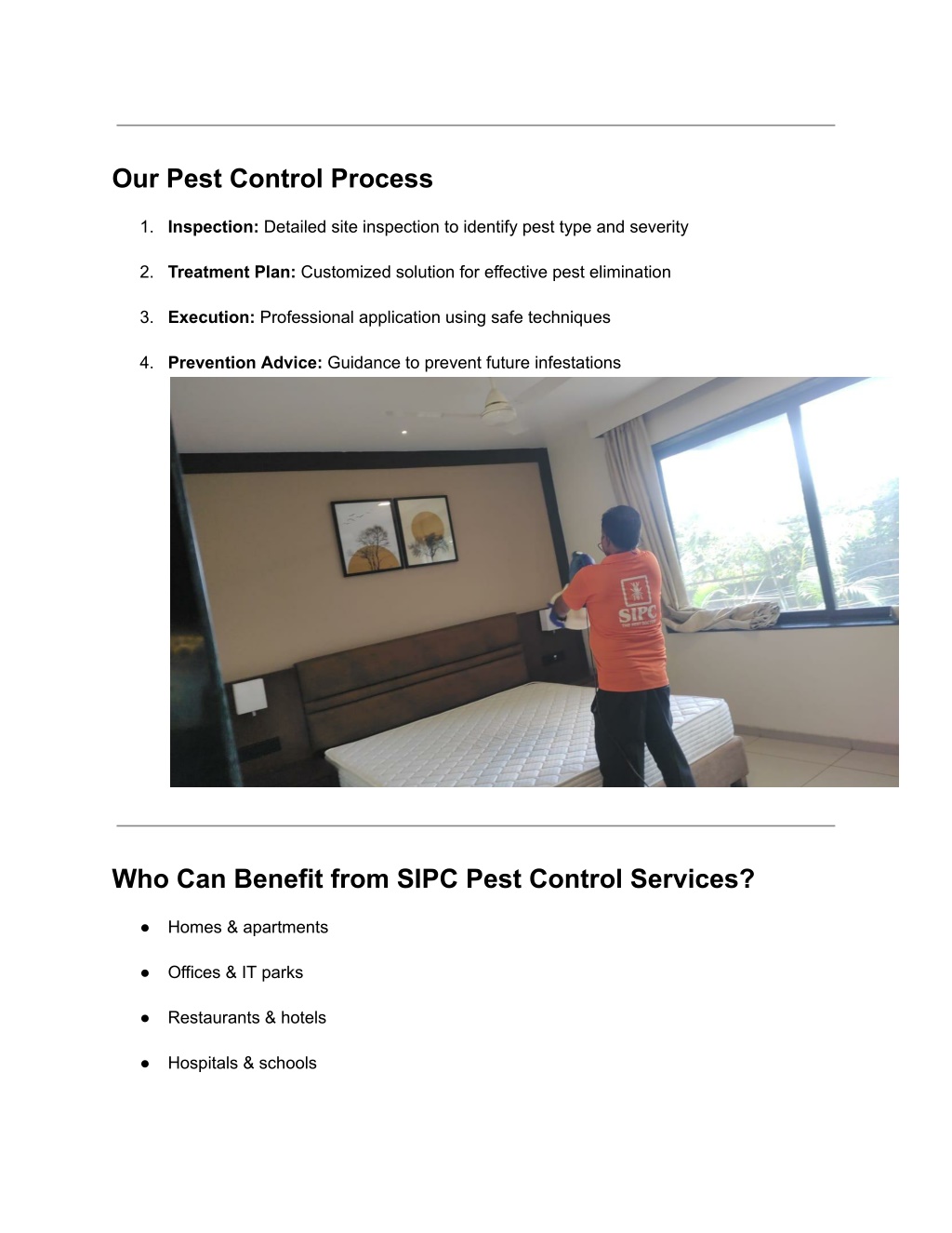 Our Pest Control Process 1. Inspection: Detailed site inspection to identify pest type and severity 2. Treatment Plan: Customized solution for effective pest elimination 3. Execution: Professional application using safe techniques 4. Prevention Advice: Guidance to prevent future infestations Who Can Benefit from SIPC Pest Control Services? ● Homes & apartments ● Offices & IT parks ● Restaurants & hotels ● Hospitals & schools