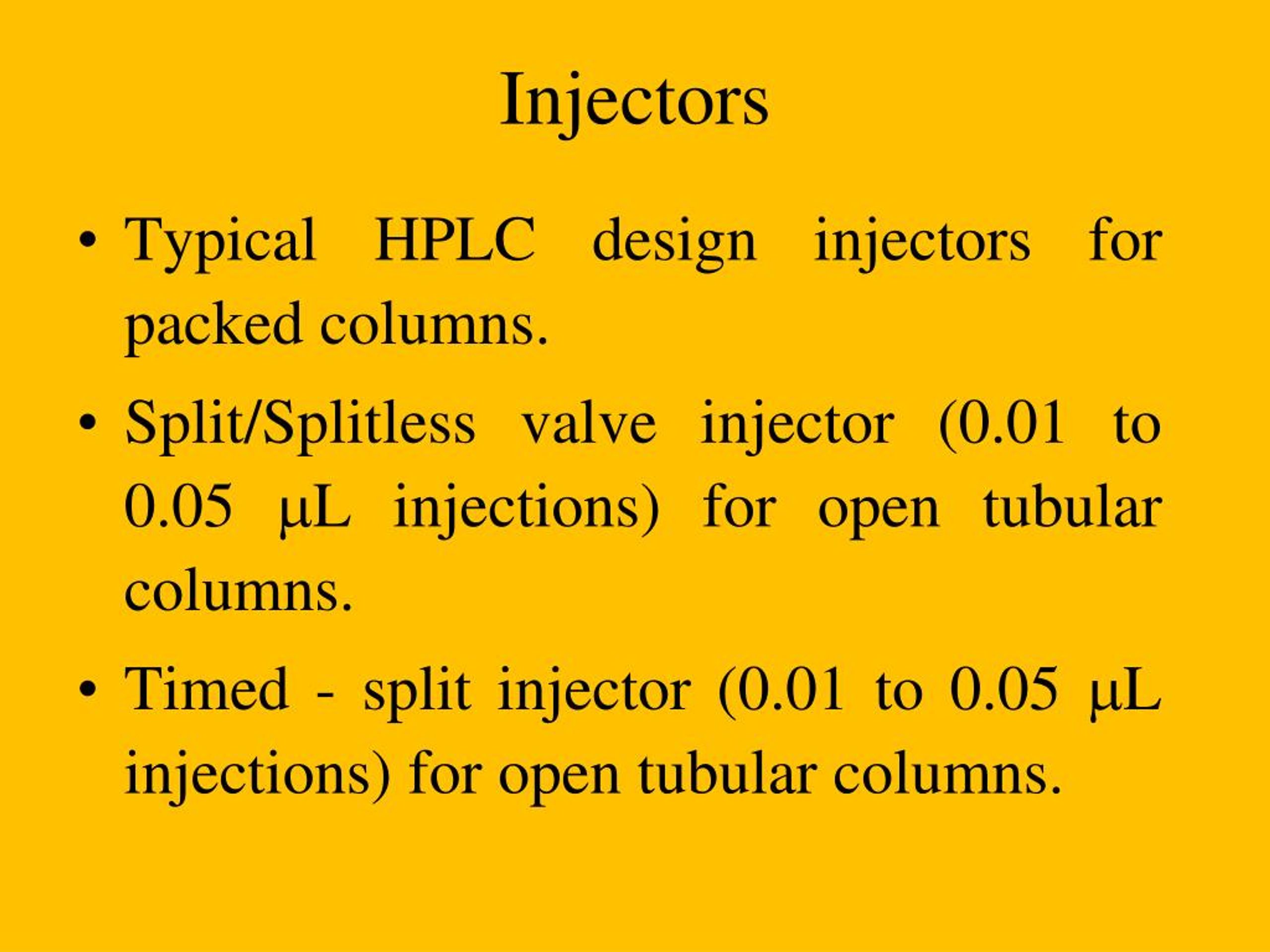 Injectors • Typical HPLC design injectors for packed columns. • Split/Splitless valve injector (0.01 to 0.05 L injections) for open tubular columns. • Timed - split injector (0.01 to 0.05 L injections) for open tubular columns.