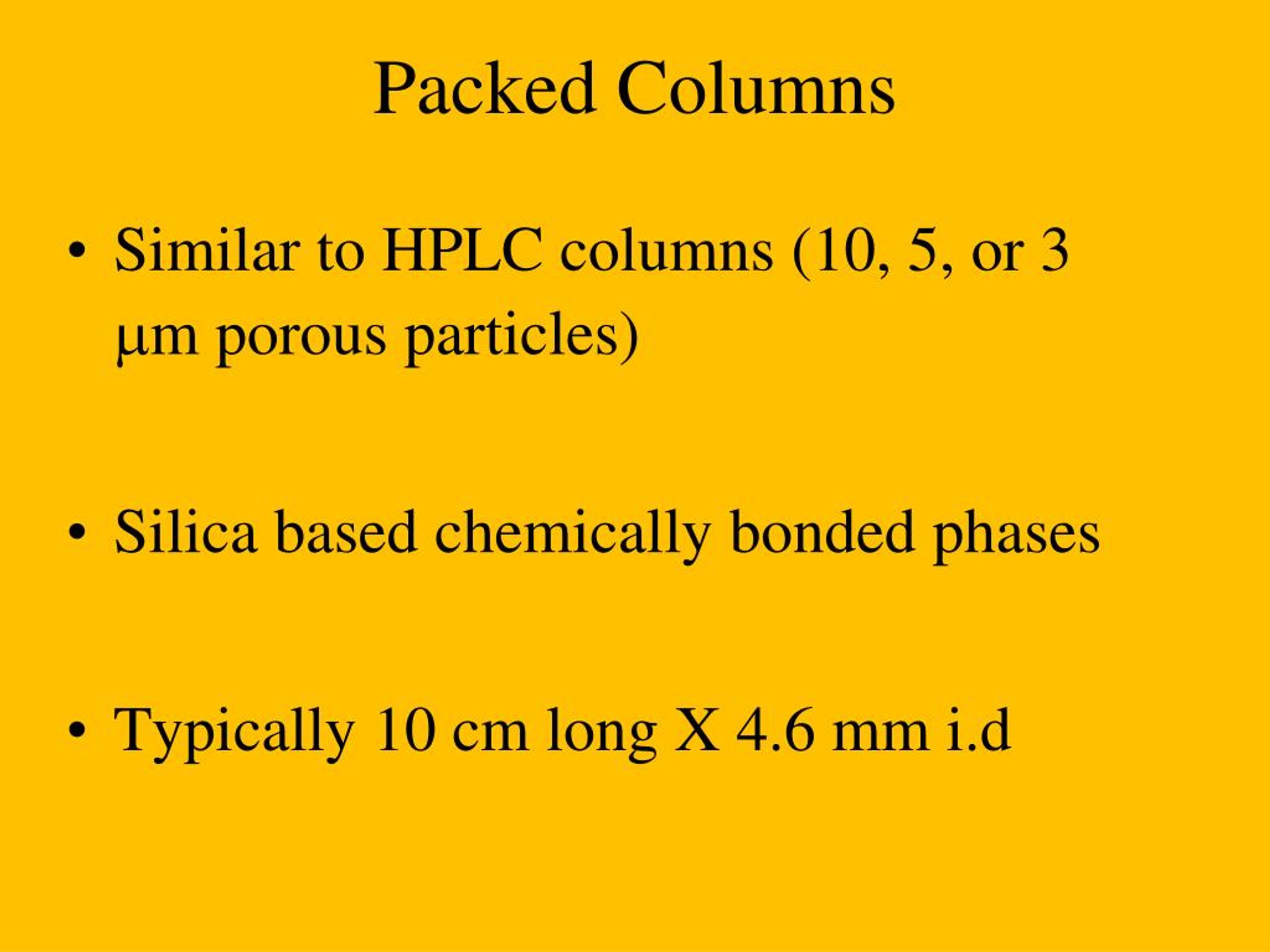 Packed Columns • Similar to HPLC columns (10, 5, or 3 m porous particles) • Silica based chemically bonded phases • Typically 10 cm long X 4.6 mm i.d