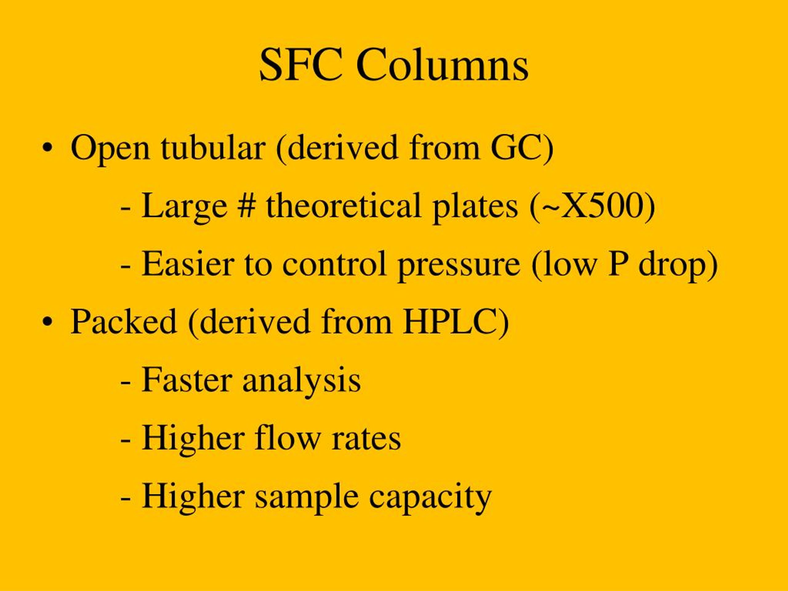 SFC Columns • Open tubular (derived from GC) - Large # theoretical plates (~X500) - Easier to control pressure (low P drop) • Packed (derived from HPLC) - Faster analysis - Higher flow rates - Higher sample capacity