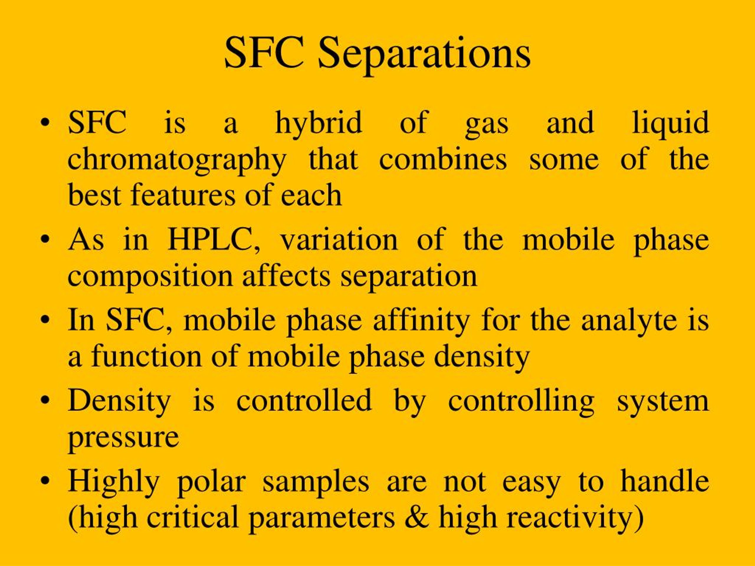 SFC Separations • SFC is a hybrid of gas and liquid chromatography that combines some of the best features of each • As in HPLC, variation of the mobile phase composition affects separation • In SFC, mobile phase affinity for the analyte is a function of mobile phase density • Density is controlled by controlling system pressure • Highly polar samples are not easy to handle (high critical parameters & high reactivity)