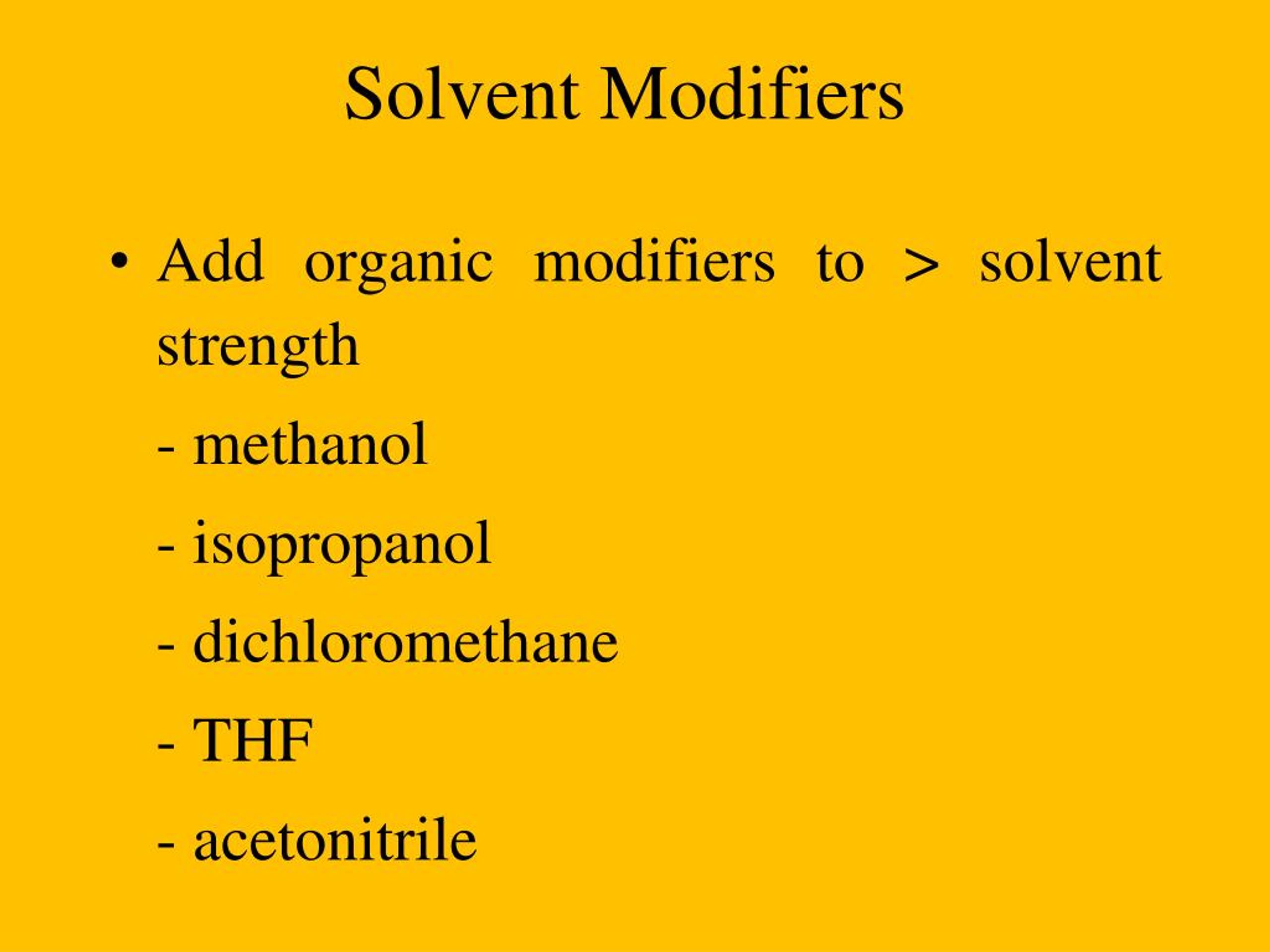Solvent Modifiers • Add organic modifiers to > solvent strength - methanol - isopropanol - dichloromethane - THF - acetonitrile