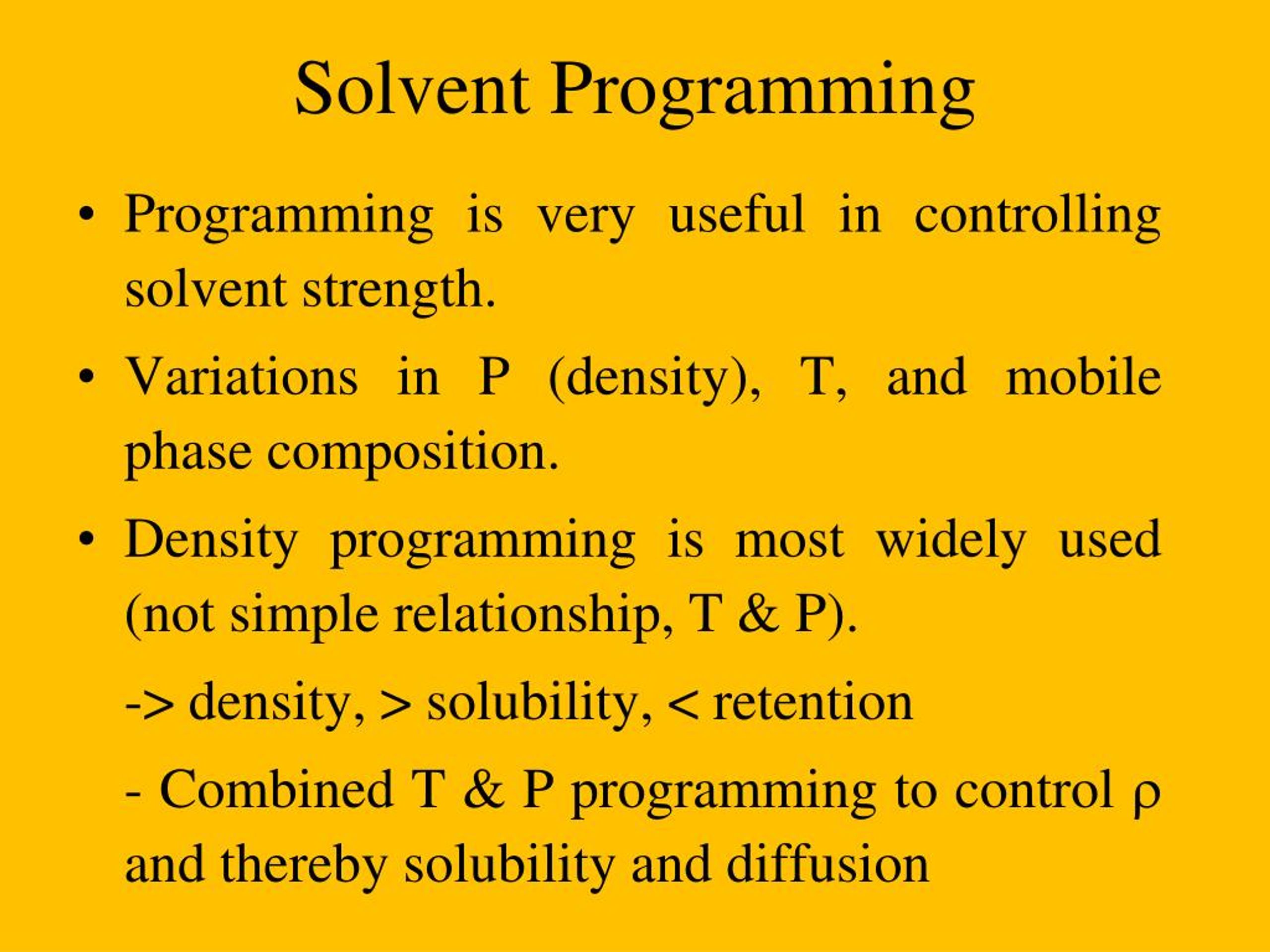 Solvent Programming • Programming is very useful in controlling solvent strength. • Variations in P (density), T, and mobile phase composition. • Density programming is most widely used (not simple relationship, T & P). -> density, > solubility, < retention - Combined T & P programming to control and thereby solubility and diffusion