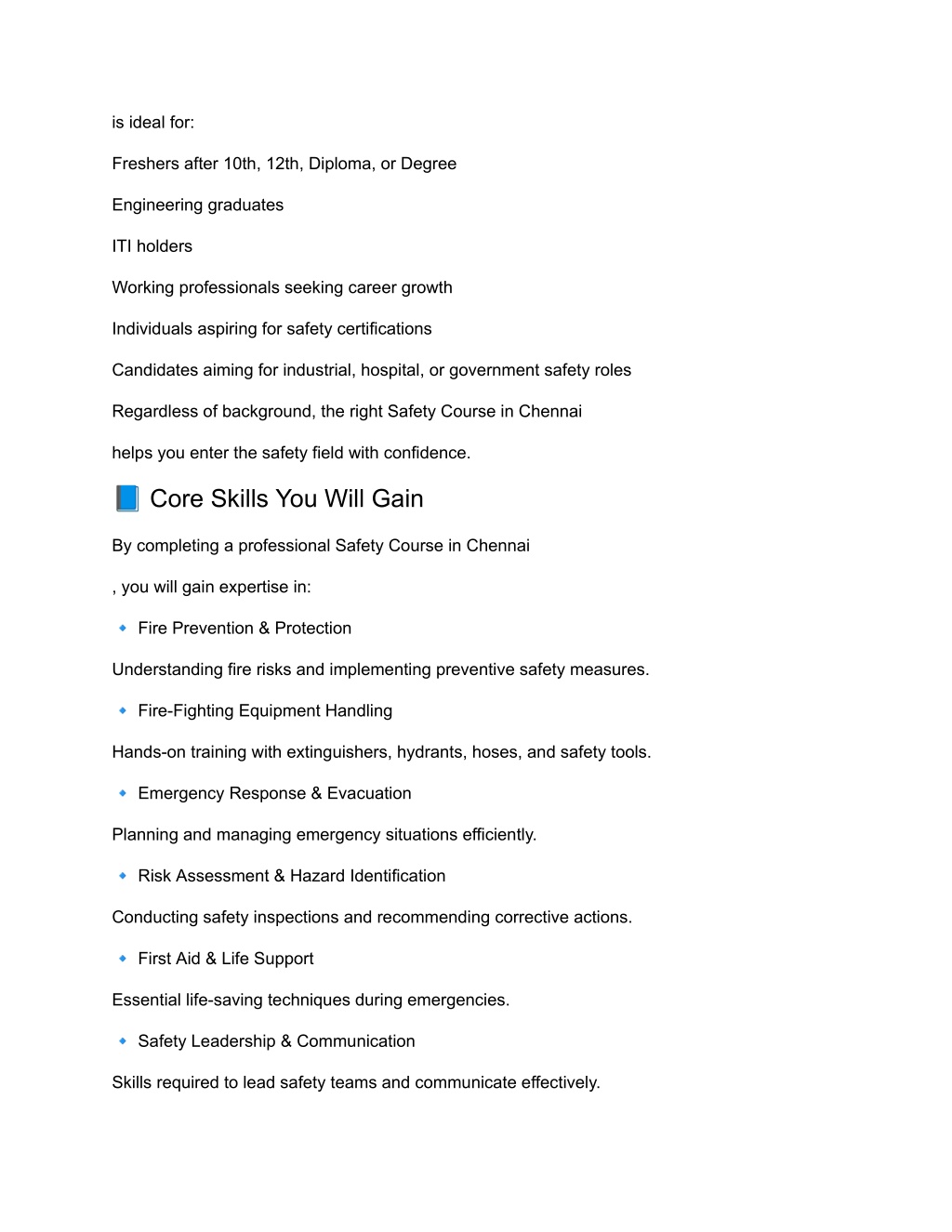 2. is ideal for: Freshers after 10th, 12th, Diploma, or Degree Engineering graduates ITI holders Working professionals seeking career growth Individuals aspiring for safety certifications Candidates aiming for industrial, hospital, or government safety roles Regardless of background, the right Safety Course in Chennai helps you enter the safety field with confidence. ? Core Skills You Will Gain By completing a professional Safety Course in Chennai , you will gain expertise in: ? Fire Prevention & Protection Understanding fire risks and implementing preventive safety measures. ? Fire-Fighting Equipment Handling Hands-on training with extinguishers, hydrants, hoses, and safety tools. ? Emergency Response & Evacuation Planning and managing emergency situations efficiently. ? Risk Assessment & Hazard Identification Conducting safety inspections and recommending corrective actions. ? First Aid & Life Support Essential life-saving techniques during emergencies. ? Safety Leadership & Communication Skills required to lead safety teams and communicate effectively.