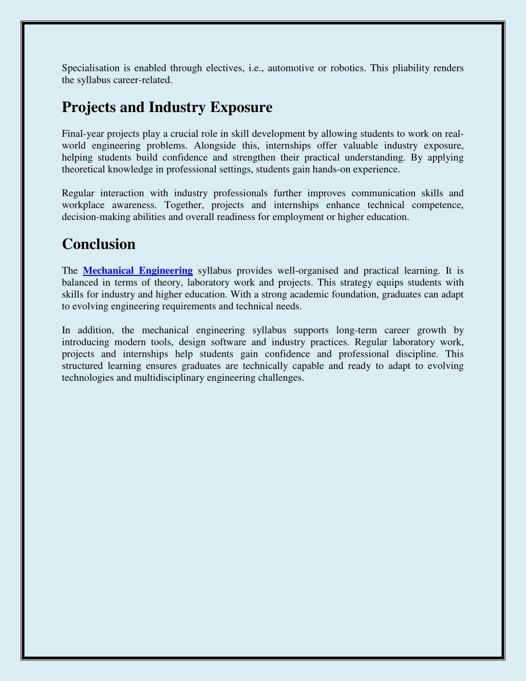 3. Specialisation is enabled through electives, i.e., automotive or robotics. This pliability renders the syllabus career-related. Projects and Industry Exposure Final-year projects play a crucial role in skill development by allowing students to work on real- world engineering problems. Alongside this, internships offer valuable industry exposure, helping students build confidence and strengthen their practical understanding. By applying theoretical knowledge in professional settings, students gain hands-on experience. Regular interaction with industry professionals further improves communication skills and workplace awareness. Together, projects and internships enhance technical competence, decision-making abilities and overall readiness for employment or higher education. Conclusion The Mechanical Engineering syllabus provides well-organised and practical learning. It is balanced in terms of theory, laboratory work and projects. This strategy equips students with skills for industry and higher education. With a strong academic foundation, graduates can adapt to evolving engineering requirements and technical needs. In addition, the mechanical engineering syllabus supports long-term career growth by introducing modern tools, design software and industry practices. Regular laboratory work, projects and internships help students gain confidence and professional discipline. This structured learning ensures graduates are technically capable and ready to adapt to evolving technologies and multidisciplinary engineering challenges.