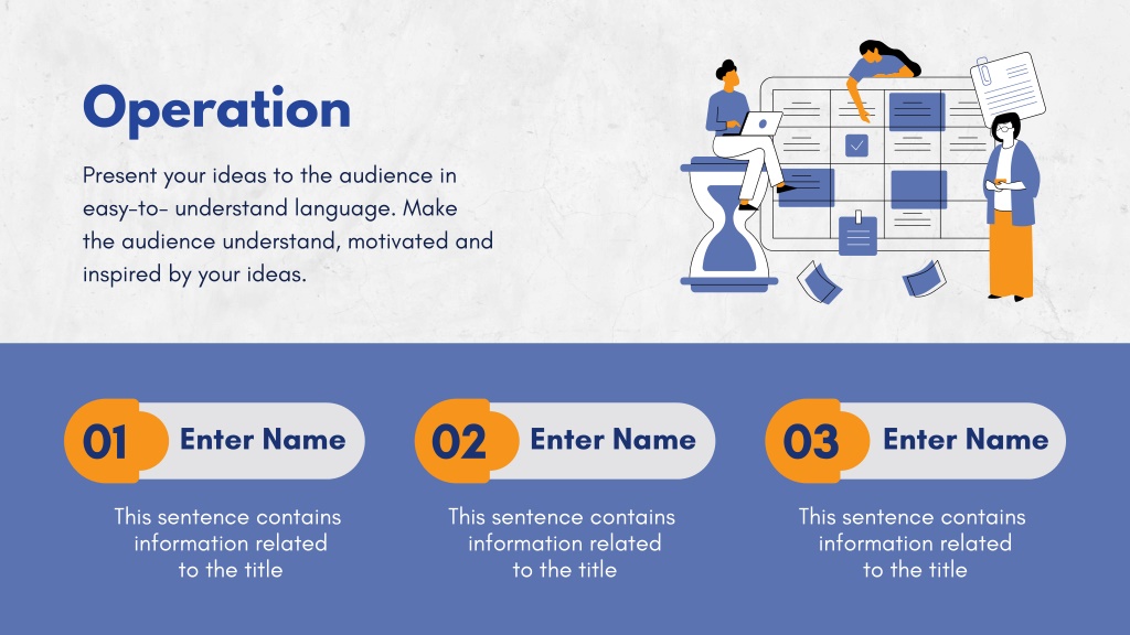 Operation Present your ideas to the audience in easy-to- understand language. Make the audience understand, motivated and inspired by your ideas. 01 02 03 Enter Name Enter Name Enter Name This sentence contains information related to the title This sentence contains information related to the title This sentence contains information related to the title
