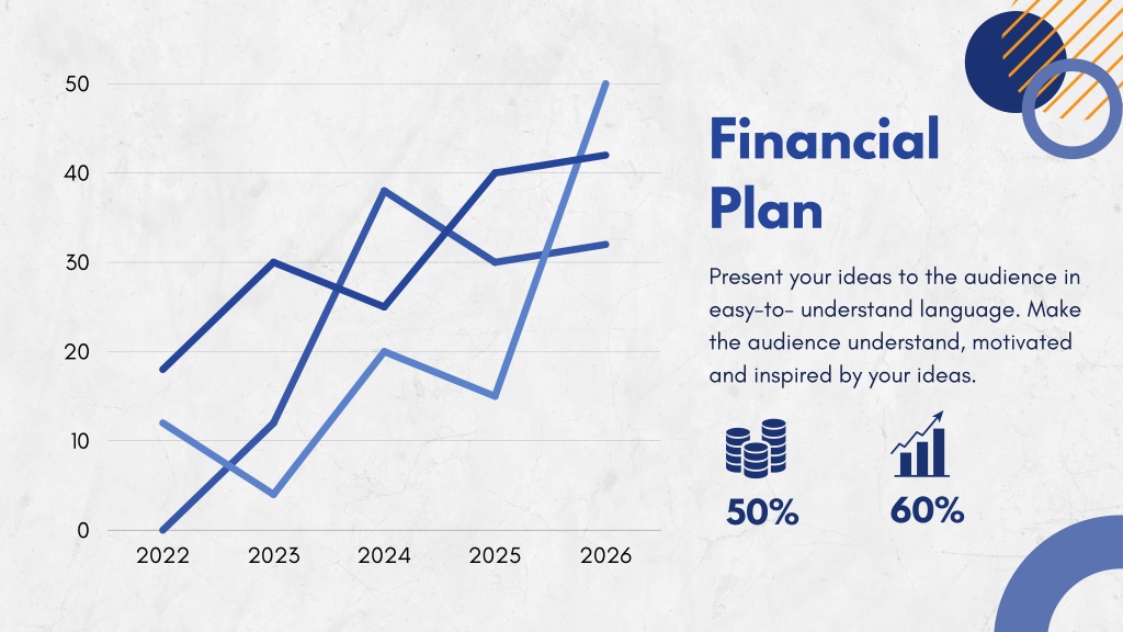 50 Financial Plan 40 30 Present your ideas to the audience in easy-to- understand language. Make the audience understand, motivated and inspired by your ideas. 20 10 60% 50% 0 2022 2023 2024 2025 2026