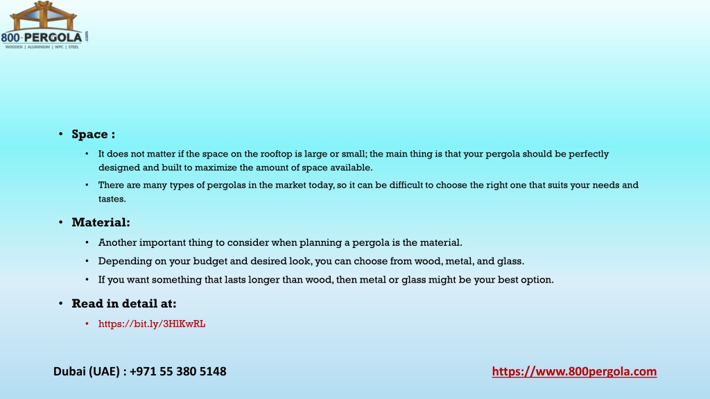 • Space : It does not matter if the space on the rooftop is large or small; the main thing is that your pergola should be perfectly designed and built to maximize the amount of space available. • There are many types of pergolas in the market today, so it can be difficult to choose the right one that suits your needs and tastes. • • Material: Another important thing to consider when planning a pergola is the material. • Depending on your budget and desired look, you can choose from wood, metal, and glass. • If you want something that lasts longer than wood, then metal or glass might be your best option. • • Read in detail at: https://bit.ly/3HlKwRL • Dubai (UAE) : +971 55 380 5148 https://www.800pergola.com