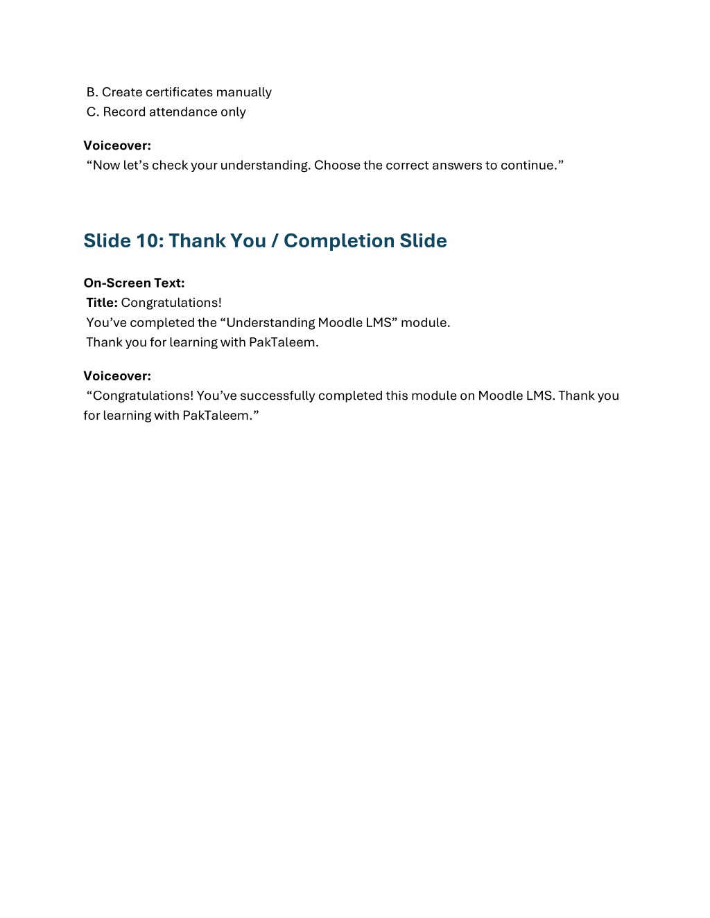 B. Create certificates manually C. Record attendance only Voiceover: “Now let’s check your understanding. Choose the correct answers to continue.” Slide 10: Thank You / Completion Slide On-Screen Text: Title: Congratulations! You’ve completed the “Understanding Moodle LMS” module. Thank you for learning with PakTaleem. Voiceover: “Congratulations! You’ve successfully completed this module on Moodle LMS. Thank you for learning with PakTaleem.”
