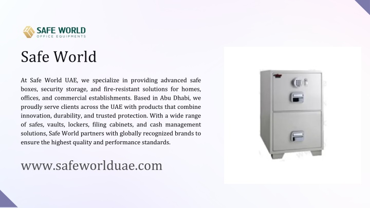 Safe World At Safe World UAE, we specialize in providing advanced safe boxes, security storage, and fire-resistant solutions for homes, offices, and commercial establishments. Based in Abu Dhabi, we proudly serve clients across the UAE with products that combine innovation, durability, and trusted protection. With a wide range of safes, vaults, lockers, filing cabinets, and cash management solutions, Safe World partners with globally recognized brands to ensure the highest quality and performance standards. www.safeworlduae.com
