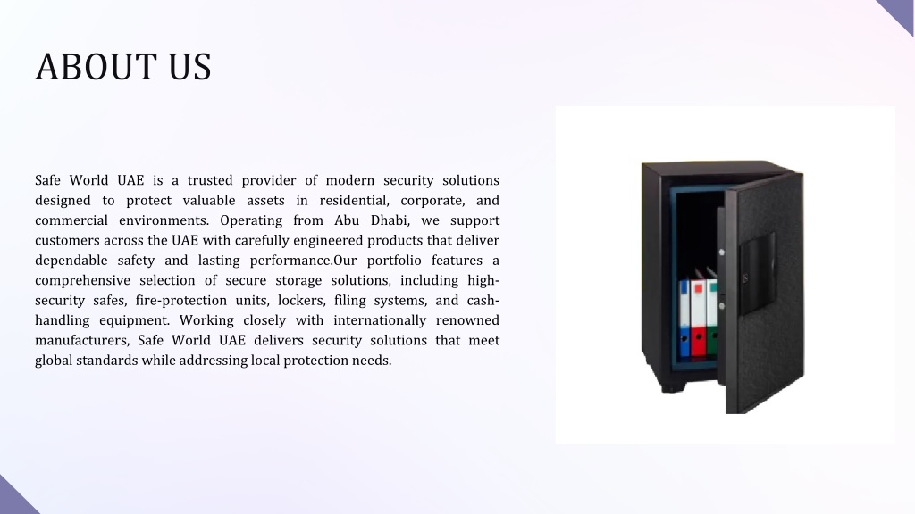 ABOUT US Safe World UAE is a trusted provider of modern security solutions designed to protect valuable assets in residential, corporate, and commercial environments. Operating from Abu Dhabi, we support customers across the UAE with carefully engineered products that deliver dependable safety and lasting performance.Our portfolio features a comprehensive selection of secure storage solutions, including high- security safes, fire-protection units, lockers, filing systems, and cash- handling equipment. Working closely with internationally renowned manufacturers, Safe World UAE delivers security solutions that meet global standards while addressing local protection needs.