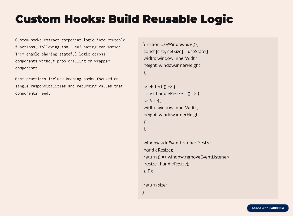 Custom Hooks: Build Reusable Logic Custom hooks extract component logic into reusable function useWindowSize() { const [size, setSize] = useState({ width: window.innerWidth, height: window.innerHeight }); functions, following the "use" naming convention. They enable sharing stateful logic across components without prop drilling or wrapper components. Best practices include keeping hooks focused on useEffect(() => { const handleResize = () => { setSize({ width: window.innerWidth, height: window.innerHeight }); }; window.addEventListener('resize', handleResize); return () => window.removeEventListener( 'resize', handleResize); }, []); single responsibilities and returning values that components need. return size; }