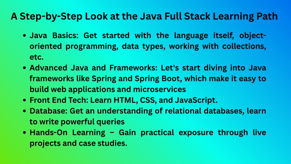 A Step-by-Step Look at the Java Full Stack Learning Path Java Basics: Get started with the language itself, object- oriented programming, data types, working with collections, etc. Advanced Java and Frameworks: Let's start diving into Java frameworks like Spring and Spring Boot, which make it easy to build web applications and microservices Front End Tech: Learn HTML, CSS, and JavaScript. Database: Get an understanding of relational databases, learn to write powerful queries Hands-On Learning – Gain practical exposure through live projects and case studies.