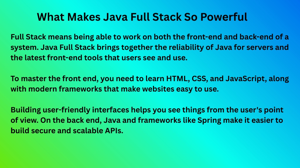What Makes Java Full Stack So Powerful Full Stack means being able to work on both the front-end and back-end of a system. Java Full Stack brings together the reliability of Java for servers and the latest front-end tools that users see and use. To master the front end, you need to learn HTML, CSS, and JavaScript, along with modern frameworks that make websites easy to use. Building user-friendly interfaces helps you see things from the user's point of view. On the back end, Java and frameworks like Spring make it easier to build secure and scalable APIs.