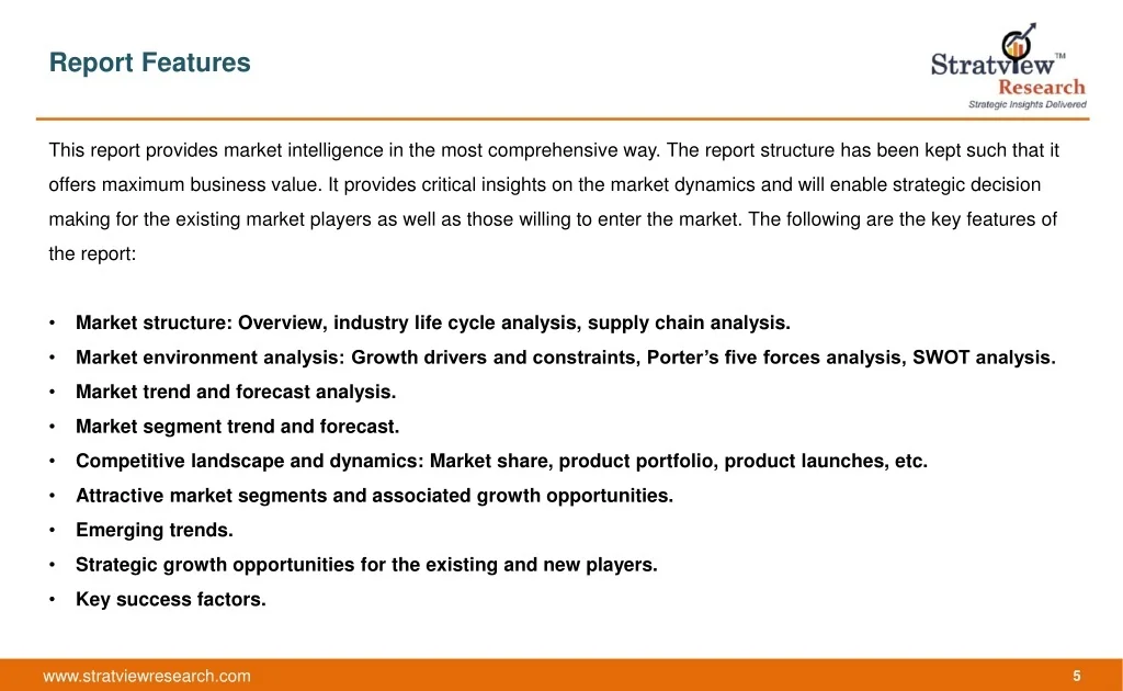 Report Features • This report provides market intelligence in the most comprehensive way. The report structure has been kept such that it offers maximum business value. It provides critical insights on the market dynamics and will enable strategic decision making for the existing market players as well as those willing to enter the market. The following are the key features of the report: • Market structure: Overview, industry life cycle analysis, supply chain analysis. • Market environment analysis: Growth drivers and constraints, Porter’s five forces analysis, SWOT analysis. • Market trend and forecast analysis. • Market segment trend and forecast. • Competitive landscape and dynamics: Market share, product portfolio, product launches, etc. • Attractive market segments and associated growth opportunities. • Emerging trends. • Strategic growth opportunities for the existing and new players. • Key success factors.