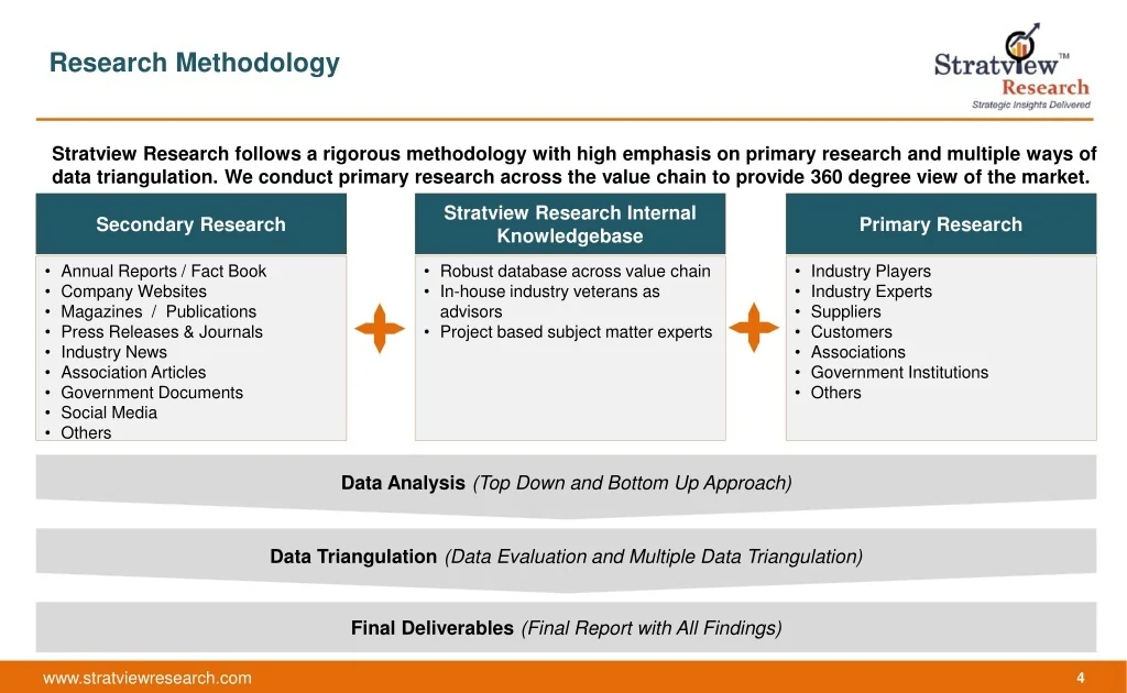 Data Analysis (Top Down and Bottom Up Approach) Research Methodology Data Triangulation (Data Evaluation and Multiple Data Triangulation) Final Deliverables (Final Report with All Findings) Stratview Research follows a rigorous methodology with high emphasis on primary research and multiple ways of data triangulation. We conduct primary research across the value chain to provide 360 degree view of the market. • Secondary Research • Stratview Research Internal Knowledgebase Primary Research • Annual Reports / Fact Book • Company Websites • Magazines / Publications • Press Releases & Journals • Industry News • Association Articles • Government Documents • Social Media • Others • Robust database across value chain • In-house industry veterans as advisors • Project based subject matter experts • Industry Players • Industry Experts • Suppliers • Customers • Associations • Government Institutions • Others