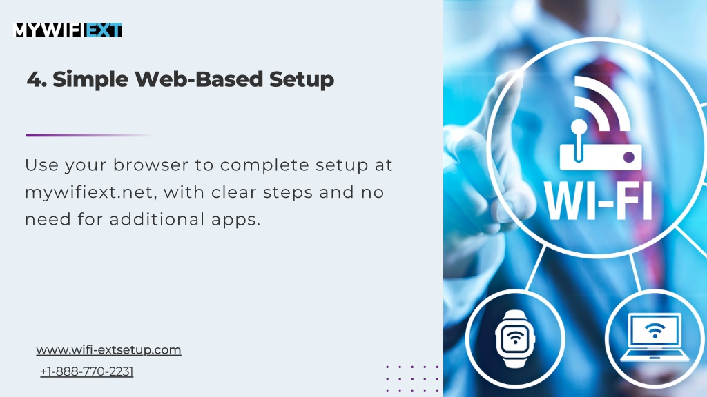 4. Simple Web-Based Setup Use your browser to complete setup at mywifiext.net, with clear steps and no need for additional apps. www.wifi-extsetup.com +1-888-770-2231