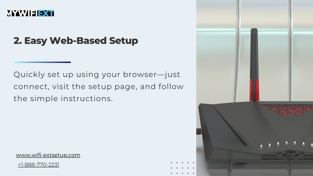 2. Easy Web-Based Setup Quickly set up using your browser—just connect, visit the setup page, and follow the simple instructions. www.wifi-extsetup.com +1-888-770-2231