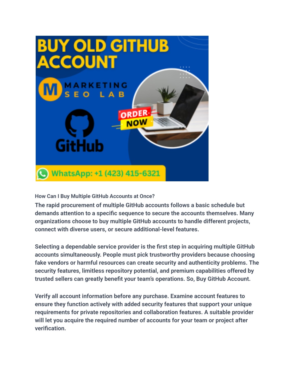 For more information please get in touch with us Email: marketingseolab24@gmail.com Telegram: @marketingseolab WhatsApp: +1 (423) 415-6321 marketingseolab.com is a trustworthy site. Where you will find various types of verified accounts, which will improve your business. So contact us now. WhatsApp: +1 (423) 415-6321 or Telegram: @marketingseolab WhatsApp: +1 (423) 415-6321 Why Should I Buy GitHub Account? Buy GitHub Account to decrease project development time while creating professional online software management solutions. A pre-made GitHub account streamlines code management collaborates with teams and maintains project organization. Developers, freelancers, and business professionals establish professional standing about their skills through GitHub usage, which leads to better credibility levels. Pre-made GitHub accounts save users from manually setting up all their necessary components. Users who need access to advanced features like private repositories should benefit from these accounts, which provide secure conditions for their work. Small startups and businesses must establish GitHub accounts to achieve smooth coding operations and effective efficiency measures. So, Buy GitHub Account. Buy GitHub Account as a business investment, and you’ll be able to grow your business and increase your productivity in your work. Your projects deserve the chance to advance, so grab this opportunity now!