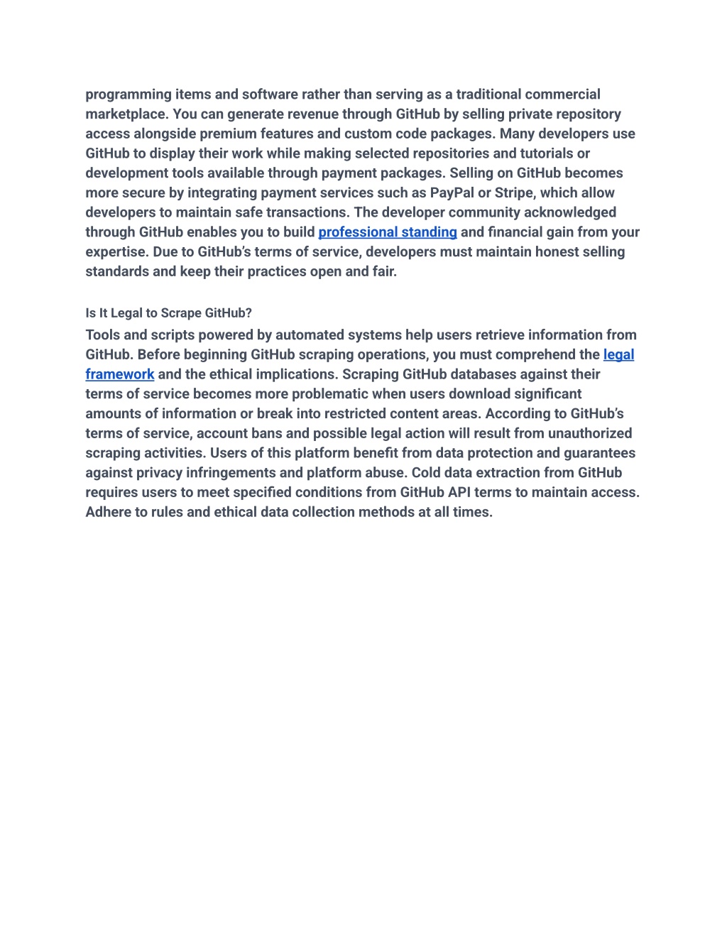 programming items and software rather than serving as a traditional commercial marketplace. You can generate revenue through GitHub by selling private repository access alongside premium features and custom code packages. Many developers use GitHub to display their work while making selected repositories and tutorials or development tools available through payment packages. Selling on GitHub becomes more secure by integrating payment services such as PayPal or Stripe, which allow developers to maintain safe transactions. The developer community acknowledged through GitHub enables you to build professional standing and financial gain from your expertise. Due to GitHub’s terms of service, developers must maintain honest selling standards and keep their practices open and fair. Is It Legal to Scrape GitHub? Tools and scripts powered by automated systems help users retrieve information from GitHub. Before beginning GitHub scraping operations, you must comprehend the legal framework and the ethical implications. Scraping GitHub databases against their terms of service becomes more problematic when users download significant amounts of information or break into restricted content areas. According to GitHub’s terms of service, account bans and possible legal action will result from unauthorized scraping activities. Users of this platform benefit from data protection and guarantees against privacy infringements and platform abuse. Cold data extraction from GitHub requires users to meet specified conditions from GitHub API terms to maintain access. Adhere to rules and ethical data collection methods at all times.