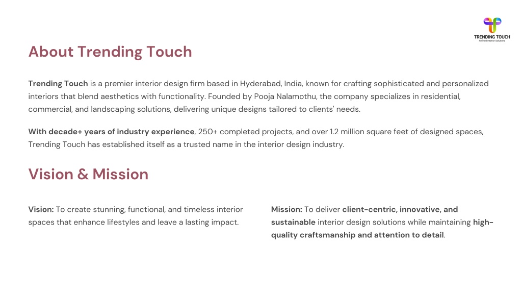 About Trending Touch Trending Touch is a premier interior design firm based in Hyderabad, India, known for crafting sophisticated and personalized interiors that blend aesthetics with functionality. Founded by Pooja Nalamothu, the company specializes in residential, commercial, and landscaping solutions, delivering unique designs tailored to clients' needs. With decade+ years of industry experience, 250+ completed projects, and over 1.2 million square feet of designed spaces, Trending Touch has established itself as a trusted name in the interior design industry. Vision & Mission Vision: To create stunning, functional, and timeless interior spaces that enhance lifestyles and leave a lasting impact. Mission: To deliver client-centric, innovative, and sustainable interior design solutions while maintaining high- quality craftsmanship and attention to detail.