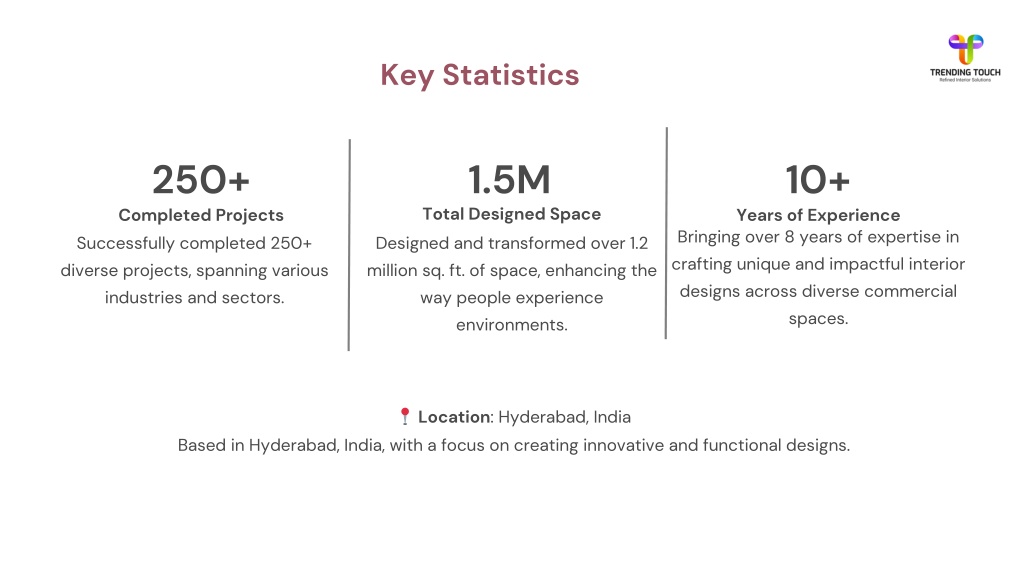 Key Statistics 250+ Completed Projects Successfully completed 250+ diverse projects, spanning various industries and sectors. 1.5M 10+ Total Designed Space Designed and transformed over 1.2 million sq. ft. of space, enhancing the way people experience environments. Years of Experience Bringing over 8 years of expertise in crafting unique and impactful interior designs across diverse commercial spaces. ?Location: Hyderabad, India Based in Hyderabad, India, with a focus on creating innovative and functional designs.