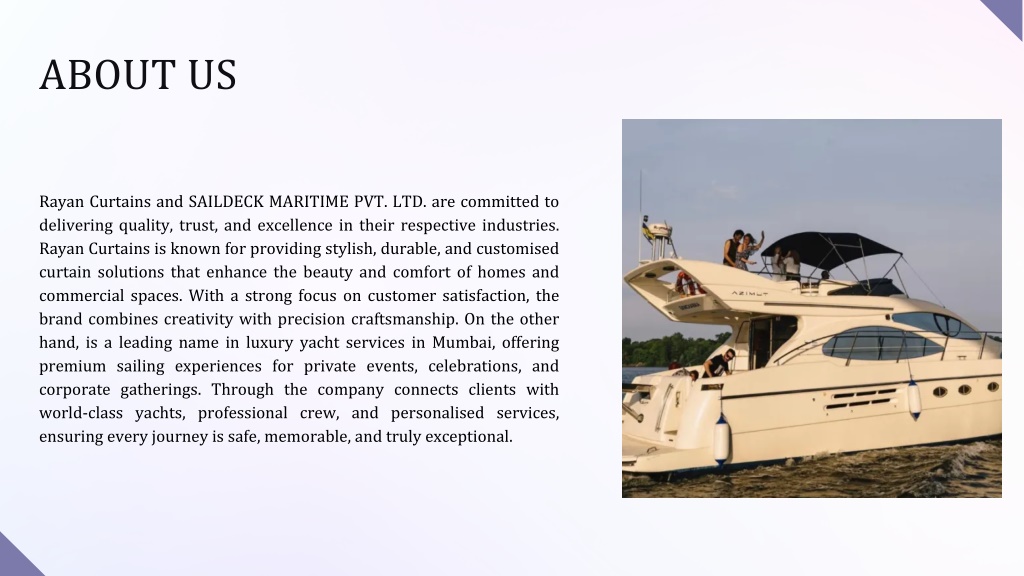 ABOUT US Rayan Curtains and SAILDECK MARITIME PVT. LTD. are committed to delivering quality, trust, and excellence in their respective industries. Rayan Curtains is known for providing stylish, durable, and customised curtain solutions that enhance the beauty and comfort of homes and commercial spaces. With a strong focus on customer satisfaction, the brand combines creativity with precision craftsmanship. On the other hand, is a leading name in luxury yacht services in Mumbai, offering premium sailing experiences for private events, celebrations, and corporate gatherings. Through the company connects clients with world-class yachts, professional crew, and personalised services, ensuring every journey is safe, memorable, and truly exceptional.