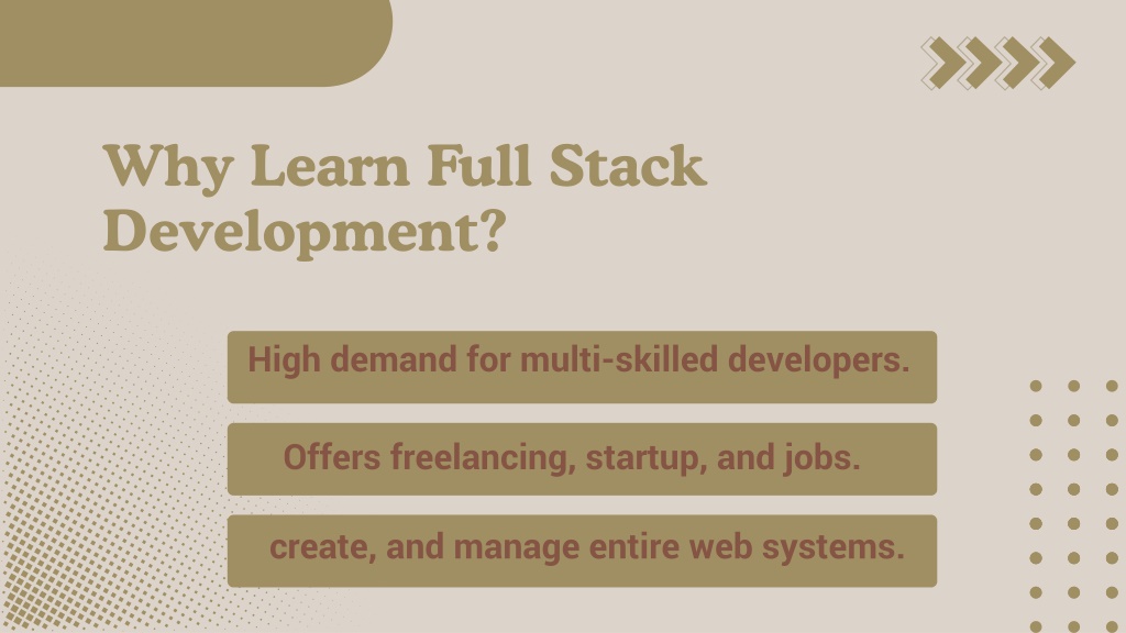 3. Why Learn Full Stack Development? High demand for multi-skilled developers. Offers freelancing, startup, and jobs. create, and manage entire web systems.