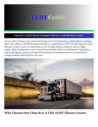 ELDT ELDTCertify Certify ELDTCertify Class B to A ELDT Theory training & Class b to a cdl eldt theory course Are you ready to advance your commercial driving career? Our Class B to A ELDT Theory training offers a fast, efficient, and FMCSA-approved pathway to upgrading your CDL. Transitioning from a Class B license to Class A opens new opportunities in the trucking industry, giving you access to bigger vehicles, higher-paying routes, and increased career flexibility. With our comprehensive Class B to A CDL ELDT theory course, you’ll gain the knowledge and confidence necessary to meet federal training standards and succeed in your career. Why Choose Our Class B to A CDL ELDT Theory Course