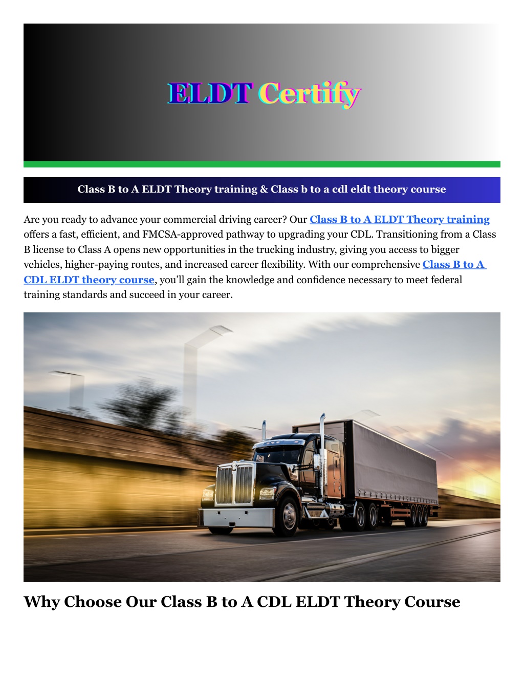 documentation is compliant and up-to-date. This step is crucial for scheduling your Class A skills test and officially upgrading your license. Career Benefits of Upgrading from Class B to A Transitioning from a Class B to Class A CDL offers numerous career advantages: Access to higher-paying routes and long-haul opportunities. Ability to operate combination vehicles and larger commercial trucks. Increased employment opportunities across freight, logistics, and transportation sectors. Enhanced professional credibility and career growth potential. Our Class b to a cdl eldt theory course is specifically designed to equip you with the skills, knowledge, and certification required to make this career advancement a reality. With FMCSA-approved training, certified instructors, and rapid TPR submission, you’ll be ready to take the next step in your commercial driving journey. Enroll Today and Upgrade Your CDL Don’t let outdated training hold back your career. Our Class B to A ELDT Theory training ensures a fast, compliant, and effective path to upgrading your CDL. Whether you’re looking to increase your earning potential, operate larger vehicles, or expand your career opportunities, our course provides the tools and certification needed to succeed. Enroll in our Class b to a cdl eldt theory course today and start your journey toward a Class A CDL. With our FMCSA-approved curriculum, certificate of completion, and efficient TPR submission process, upgrading your license has never been easier. Take control of your career and get started now! Thank You Thank You Thank You