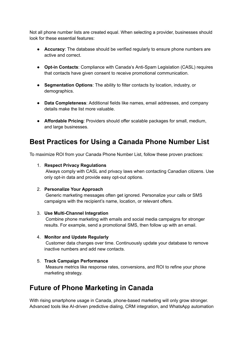 Not all phone number lists are created equal. When selecting a provider, businesses should look for these essential features: ● Accuracy: The database should be verified regularly to ensure phone numbers are active and correct. ● Opt-in Contacts: Compliance with Canada’s Anti-Spam Legislation (CASL) requires that contacts have given consent to receive promotional communication. ● Segmentation Options: The ability to filter contacts by location, industry, or demographics. ● Data Completeness: Additional fields like names, email addresses, and company details make the list more valuable. ● Affordable Pricing: Providers should offer scalable packages for small, medium, and large businesses. Best Practices for Using a Canada Phone Number List To maximize ROI from your Canada Phone Number List, follow these proven practices: 1. Respect Privacy Regulations Always comply with CASL and privacy laws when contacting Canadian citizens. Use only opt-in data and provide easy opt-out options. 2. Personalize Your Approach Generic marketing messages often get ignored. Personalize your calls or SMS campaigns with the recipient’s name, location, or relevant offers. 3. Use Multi-Channel Integration Combine phone marketing with emails and social media campaigns for stronger results. For example, send a promotional SMS, then follow up with an email. 4. Monitor and Update Regularly Customer data changes over time. Continuously update your database to remove inactive numbers and add new contacts. 5. Track Campaign Performance Measure metrics like response rates, conversions, and ROI to refine your phone marketing strategy. Future of Phone Marketing in Canada With rising smartphone usage in Canada, phone-based marketing will only grow stronger. Advanced tools like AI-driven predictive dialing, CRM integration, and WhatsApp automation