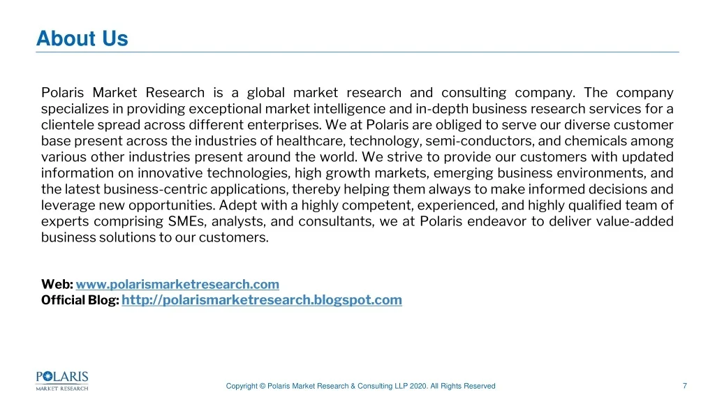 About Us Polaris Market Research is a global market research and consulting company. The company specializes in providing exceptional market intelligence and in-depth business research services for a clientele spread across different enterprises. We at Polaris are obliged to serve our diverse customer base present across the industries of healthcare, technology, semi-conductors, and chemicals among various other industries present around the world. We strive to provide our customers with updated information on innovative technologies, high growth markets, emerging business environments, and the latest business-centric applications, thereby helping them always to make informed decisions and leverage new opportunities. Adept with a highly competent, experienced, and highly qualified team of experts comprising SMEs, analysts, and consultants, we at Polaris endeavor to deliver value-added business solutions to our customers. Web: www.polarismarketresearch.com Official Blog: http://polarismarketresearch.blogspot.com