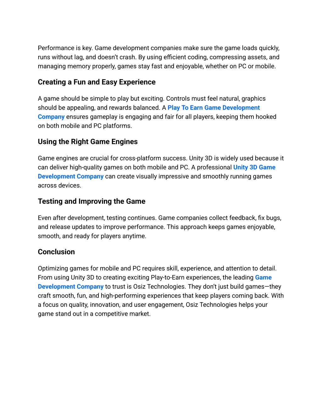 Performance is key. Game development companies make sure the game loads quickly, runs without lag, and doesn’t crash. By using efficient coding, compressing assets, and managing memory properly, games stay fast and enjoyable, whether on PC or mobile. Creating a Fun and Easy Experience A game should be simple to play but exciting. Controls must feel natural, graphics should be appealing, and rewards balanced. A Play To Earn Game Development Company ensures gameplay is engaging and fair for all players, keeping them hooked on both mobile and PC platforms. Using the Right Game Engines Game engines are crucial for cross-platform success. Unity 3D is widely used because it can deliver high-quality games on both mobile and PC. A professional Unity 3D Game Development Company can create visually impressive and smoothly running games across devices. Testing and Improving the Game Even after development, testing continues. Game companies collect feedback, fix bugs, and release updates to improve performance. This approach keeps games enjoyable, smooth, and ready for players anytime. Conclusion Optimizing games for mobile and PC requires skill, experience, and attention to detail. From using Unity 3D to creating exciting Play-to-Earn experiences, the leading Game Development Company to trust is Osiz Technologies. They don’t just build games—they craft smooth, fun, and high-performing experiences that keep players coming back. With a focus on quality, innovation, and user engagement, Osiz Technologies helps your game stand out in a competitive market.