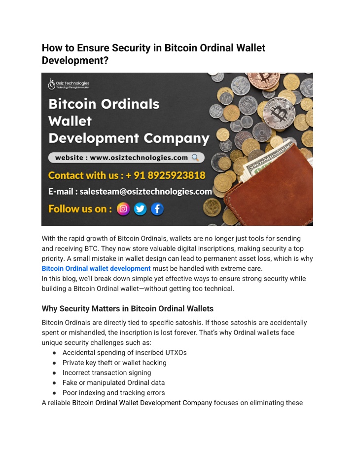 How to Ensure Security in Bitcoin Ordinal Wallet Development? With the rapid growth of Bitcoin Ordinals, wallets are no longer just tools for sending and receiving BTC. They now store valuable digital inscriptions, making security a top priority. A small mistake in wallet design can lead to permanent asset loss, which is why Bitcoin Ordinal wallet development must be handled with extreme care. In this blog, we’ll break down simple yet effective ways to ensure strong security while building a Bitcoin Ordinal wallet—without getting too technical. Why Security Matters in Bitcoin Ordinal Wallets Bitcoin Ordinals are directly tied to specific satoshis. If those satoshis are accidentally spent or mishandled, the inscription is lost forever. That’s why Ordinal wallets face unique security challenges such as: ● Accidental spending of inscribed UTXOs ● Private key theft or wallet hacking ● Incorrect transaction signing ● Fake or manipulated Ordinal data ● Poor indexing and tracking errors A reliable Bitcoin Ordinal Wallet Development Company focuses on eliminating these