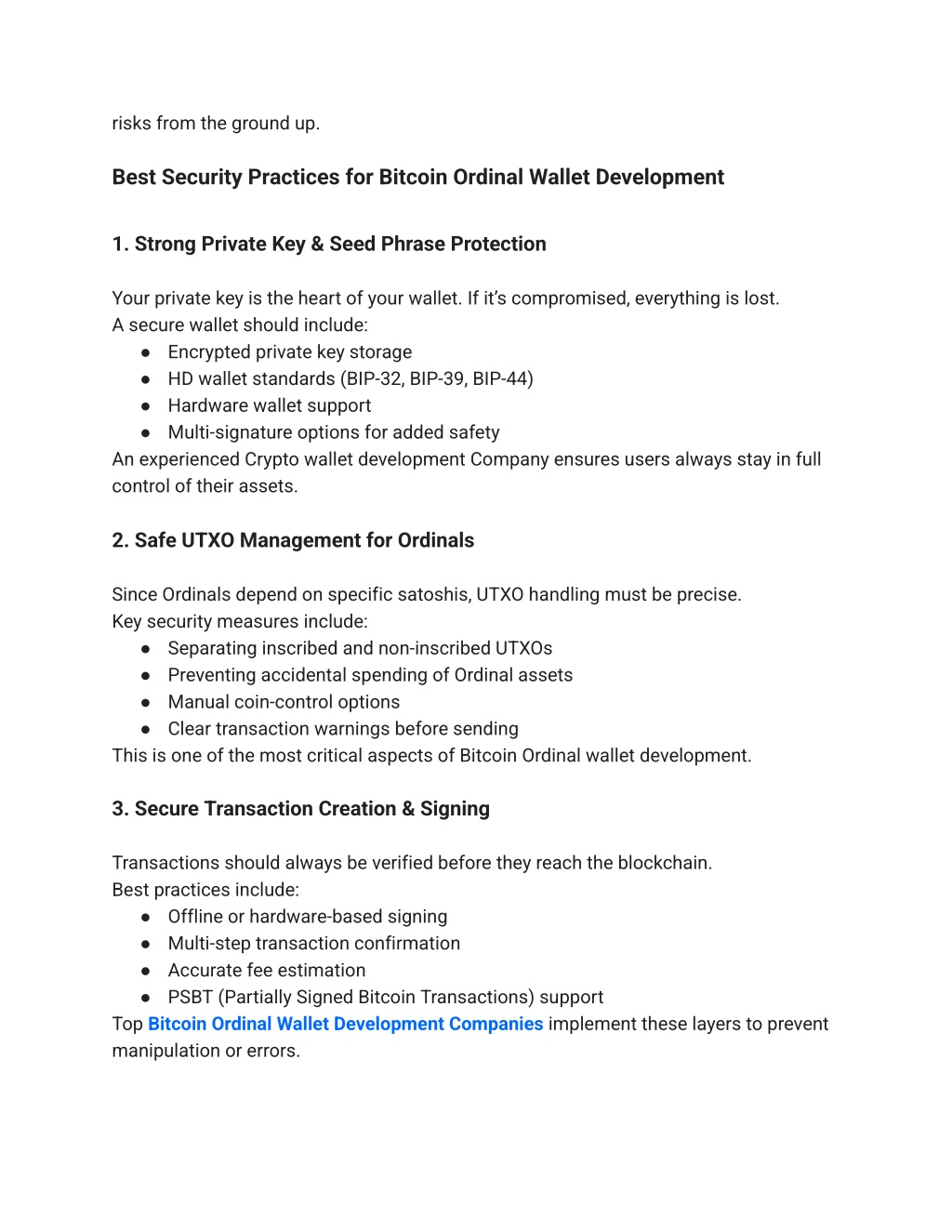 risks from the ground up. Best Security Practices for Bitcoin Ordinal Wallet Development 1. Strong Private Key & Seed Phrase Protection Your private key is the heart of your wallet. If it’s compromised, everything is lost. A secure wallet should include: ● Encrypted private key storage ● HD wallet standards (BIP-32, BIP-39, BIP-44) ● Hardware wallet support ● Multi-signature options for added safety An experienced Crypto wallet development Company ensures users always stay in full control of their assets. 2. Safe UTXO Management for Ordinals Since Ordinals depend on specific satoshis, UTXO handling must be precise. Key security measures include: ● Separating inscribed and non-inscribed UTXOs ● Preventing accidental spending of Ordinal assets ● Manual coin-control options ● Clear transaction warnings before sending This is one of the most critical aspects of Bitcoin Ordinal wallet development. 3. Secure Transaction Creation & Signing Transactions should always be verified before they reach the blockchain. Best practices include: ● Offline or hardware-based signing ● Multi-step transaction confirmation ● Accurate fee estimation ● PSBT (Partially Signed Bitcoin Transactions) support Top Bitcoin Ordinal Wallet Development Companies implement these layers to prevent manipulation or errors.