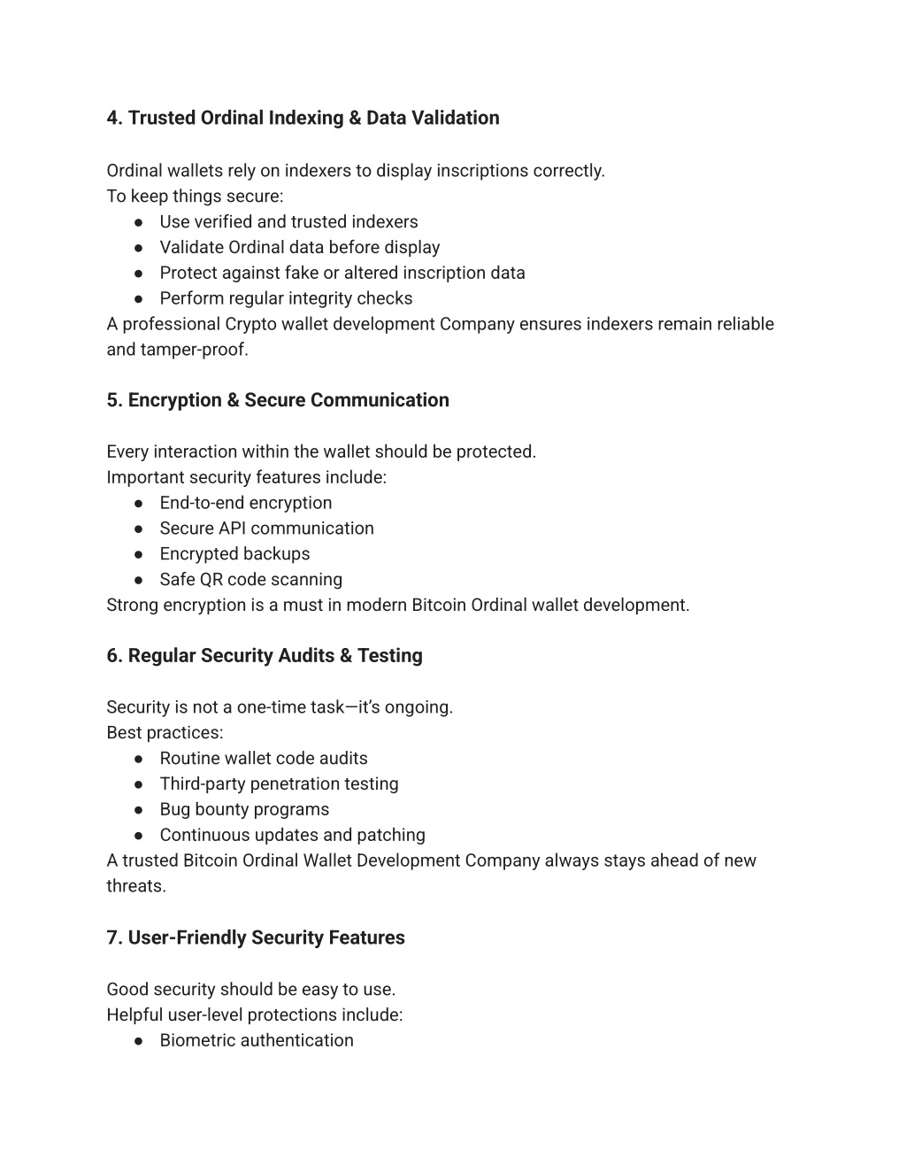 4. Trusted Ordinal Indexing & Data Validation Ordinal wallets rely on indexers to display inscriptions correctly. To keep things secure: ● Use verified and trusted indexers ● Validate Ordinal data before display ● Protect against fake or altered inscription data ● Perform regular integrity checks A professional Crypto wallet development Company ensures indexers remain reliable and tamper-proof. 5. Encryption & Secure Communication Every interaction within the wallet should be protected. Important security features include: ● End-to-end encryption ● Secure API communication ● Encrypted backups ● Safe QR code scanning Strong encryption is a must in modern Bitcoin Ordinal wallet development. 6. Regular Security Audits & Testing Security is not a one-time task—it’s ongoing. Best practices: ● Routine wallet code audits ● Third-party penetration testing ● Bug bounty programs ● Continuous updates and patching A trusted Bitcoin Ordinal Wallet Development Company always stays ahead of new threats. 7. User-Friendly Security Features Good security should be easy to use. Helpful user-level protections include: ● Biometric authentication