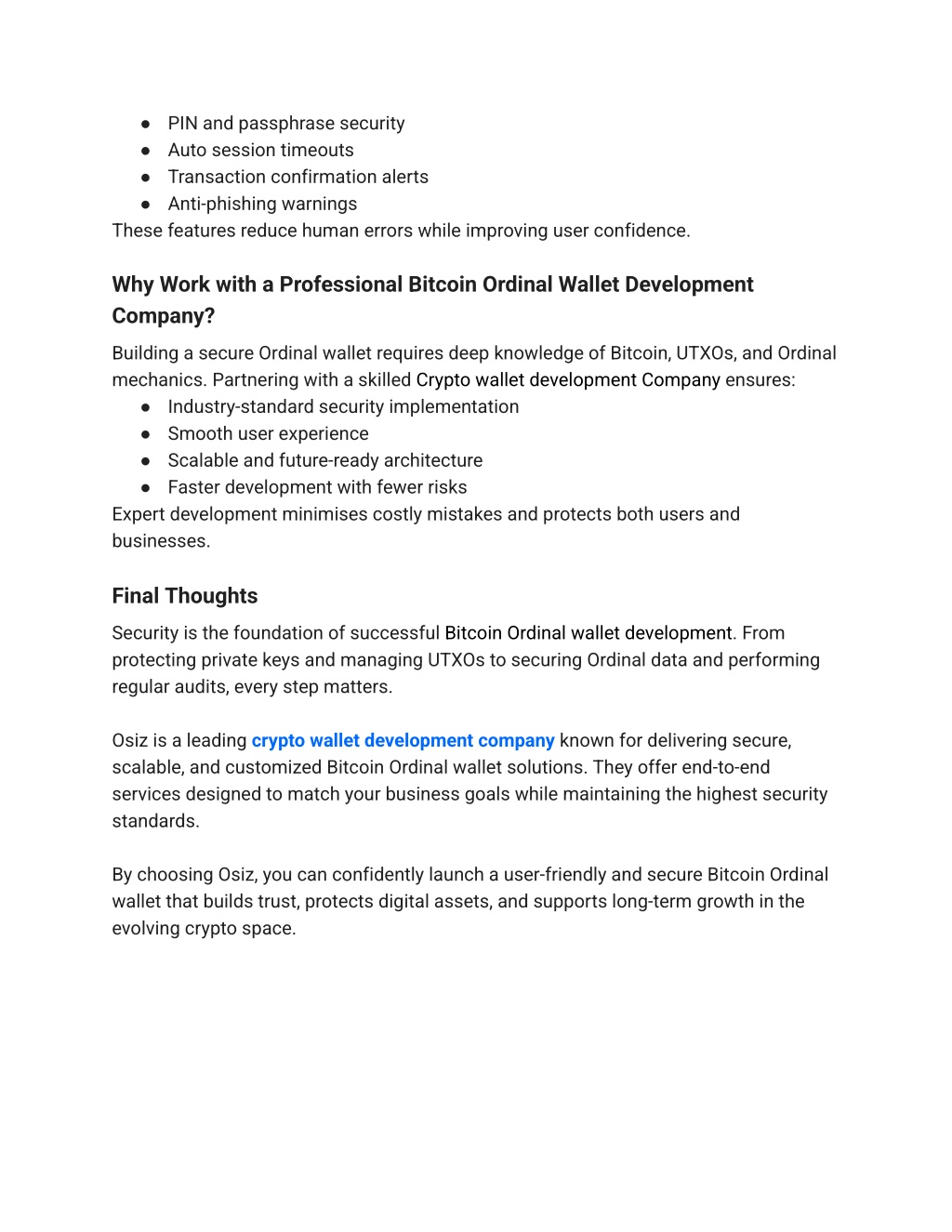 ● PIN and passphrase security ● Auto session timeouts ● Transaction confirmation alerts ● Anti-phishing warnings These features reduce human errors while improving user confidence. Why Work with a Professional Bitcoin Ordinal Wallet Development Company? Building a secure Ordinal wallet requires deep knowledge of Bitcoin, UTXOs, and Ordinal mechanics. Partnering with a skilled Crypto wallet development Company ensures: ● Industry-standard security implementation ● Smooth user experience ● Scalable and future-ready architecture ● Faster development with fewer risks Expert development minimises costly mistakes and protects both users and businesses. Final Thoughts Security is the foundation of successful Bitcoin Ordinal wallet development. From protecting private keys and managing UTXOs to securing Ordinal data and performing regular audits, every step matters. Osiz is a leading crypto wallet development company known for delivering secure, scalable, and customized Bitcoin Ordinal wallet solutions. They offer end-to-end services designed to match your business goals while maintaining the highest security standards. By choosing Osiz, you can confidently launch a user-friendly and secure Bitcoin Ordinal wallet that builds trust, protects digital assets, and supports long-term growth in the evolving crypto space.