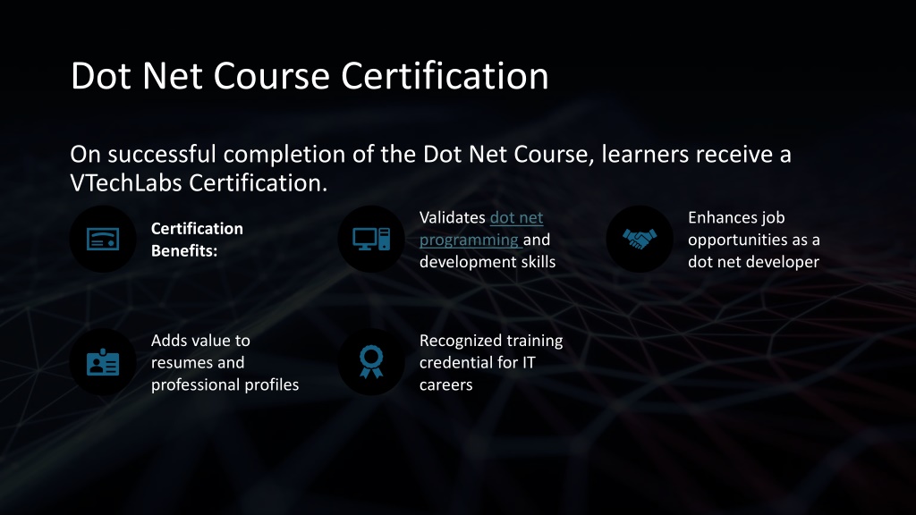 Dot Net Course Certification On successful completion of the Dot Net Course, learners receive a VTechLabs Certification.