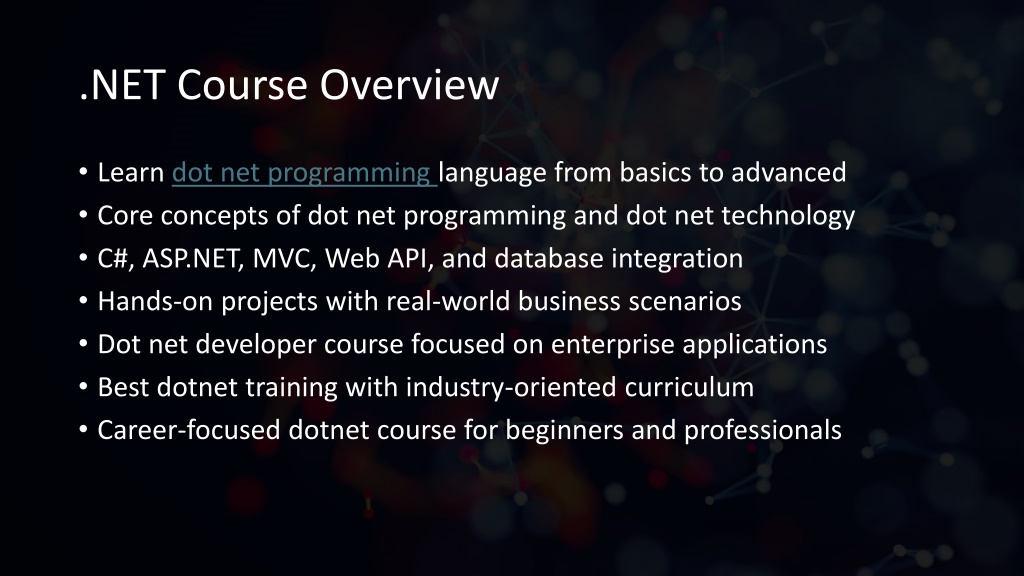 .NET Course Overview • Learn dot net programming language from basics to advanced • Core concepts of dot net programming and dot net technology • C#, ASP.NET, MVC, Web API, and database integration • Hands-on projects with real-world business scenarios • Dot net developer course focused on enterprise applications • Best dotnet training with industry-oriented curriculum • Career-focused dotnet course for beginners and professionals